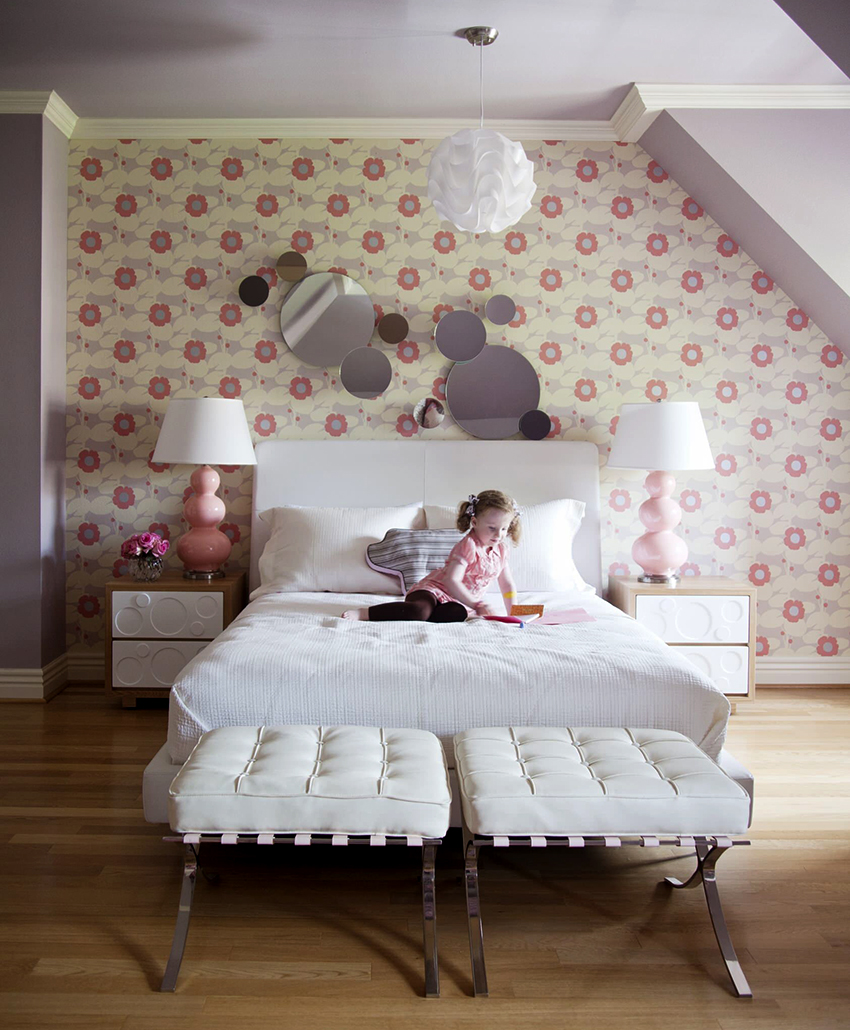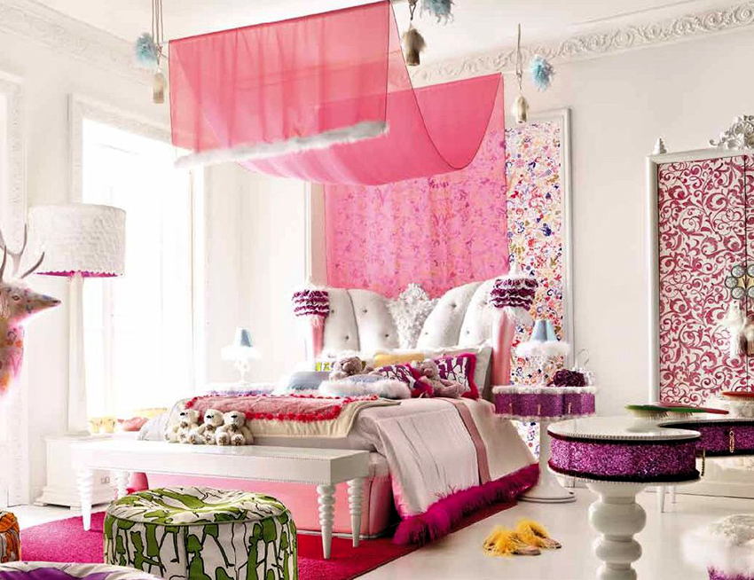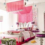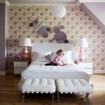 Un patrón decorativo en la pared (desde la cama hasta el techo), por ejemplo, ramas de sakura en flor en un estilo oriental, una cortina rococó francesa que cae o un dosel de techo barroco, no se verán menos hermosos.