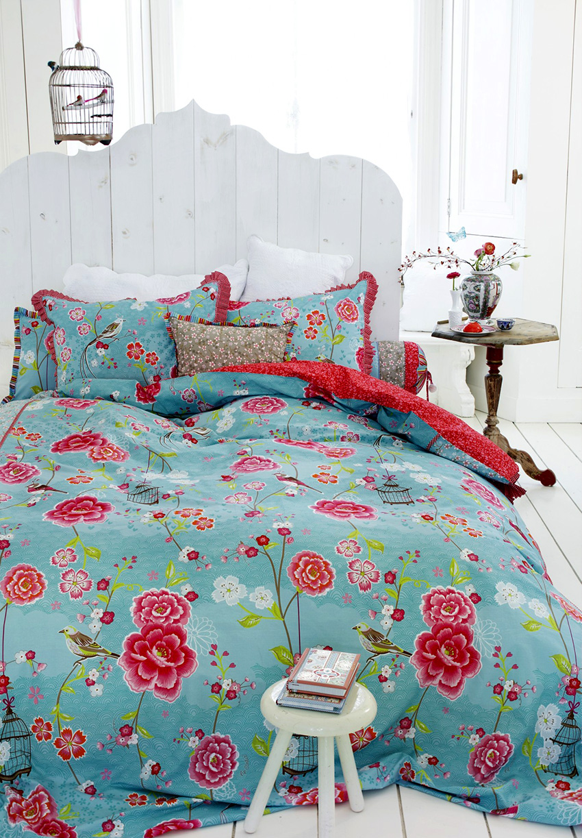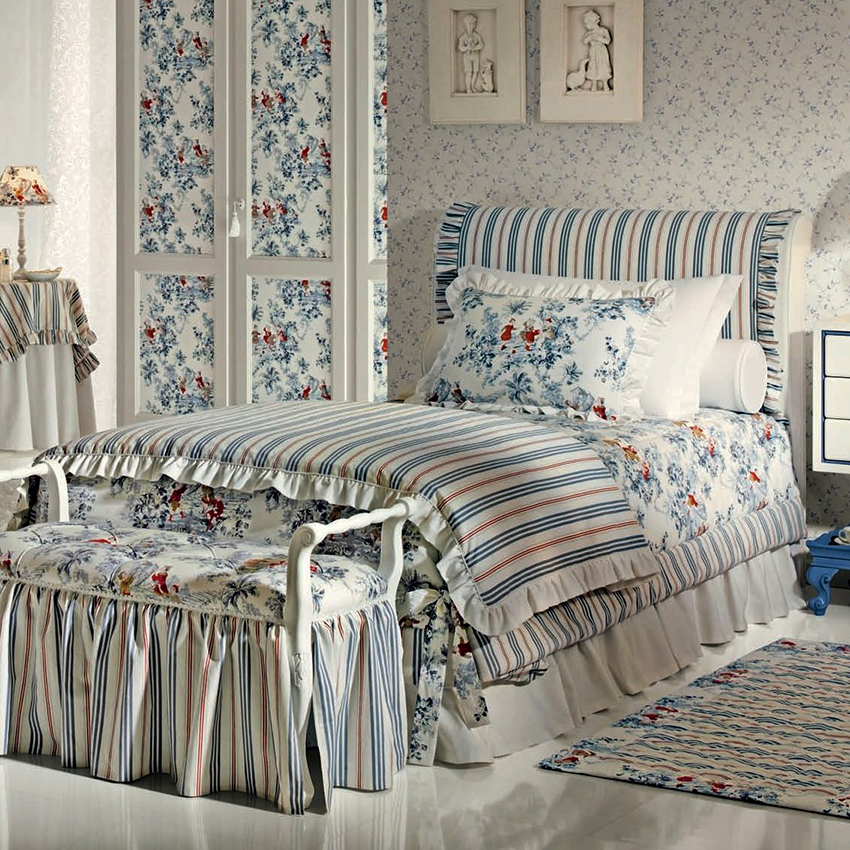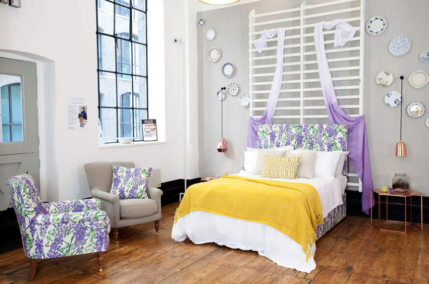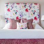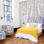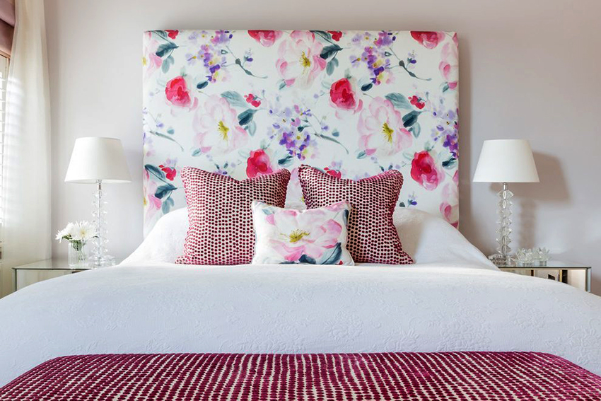 - Aplicación de estampados florales. Esta opción es adecuada para los fanáticos del romance. Un buen ejemplo es la suave tapicería del respaldo realizada en material con flores o el uso de un panel floral en lugar de un cabecero.