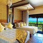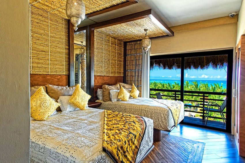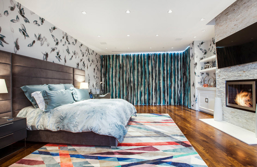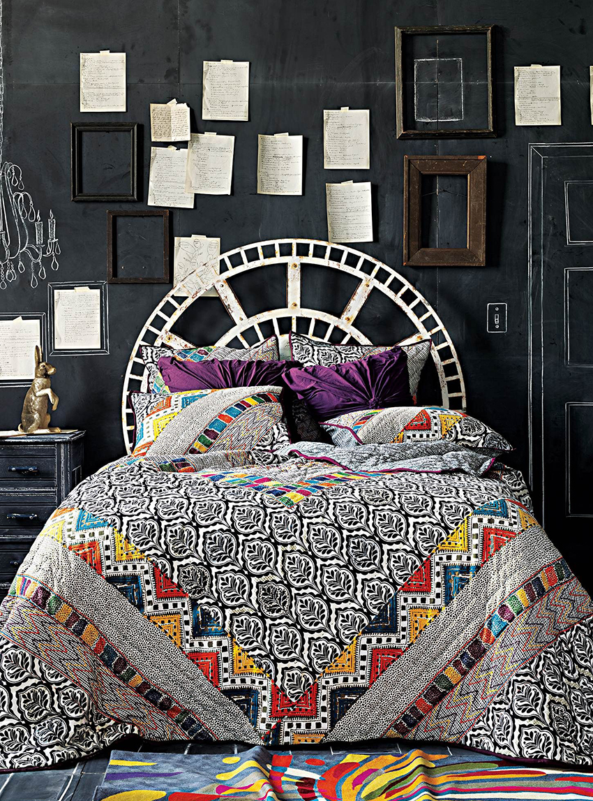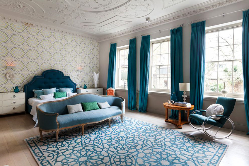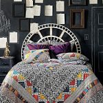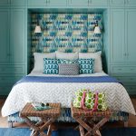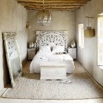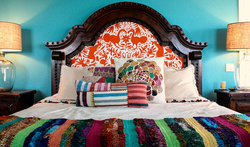 Si pinta una pared con una cabecera en un color opuesto al tono de otras superficies, puede obtener el efecto de la zonificación del espacio. En el estilo étnico, los lienzos de las paredes en la cabecera siguen siendo relevantes, pero solo son similares en apariencia a las alfombras del pasado soviético: su textura es mucho más práctica.