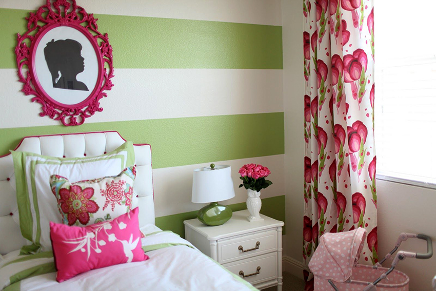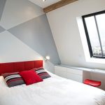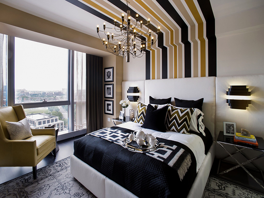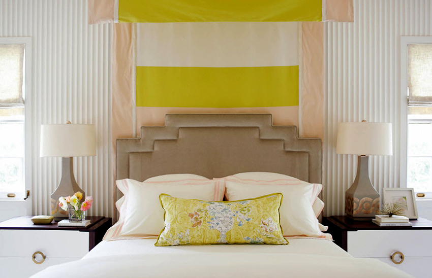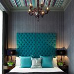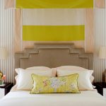 Un lugar especial en la diversidad de especies de cabeceras está ocupado por un respaldo alto, que visualmente le permite aumentar la altura del techo. Al mismo tiempo, no es necesario coser un telón de fondo con tela o crearlo con madera, basta con pintar la pared detrás de la cama en un color diferente. El cabecero con rayas verticales que llegan al techo se verá original. Los colores brillantes ayudarán a "hacer estallar" un interior aburrido. Para emparejar las rayas, vale la pena dibujar un boceto con un lápiz y aplicar pintura con cinta adhesiva.