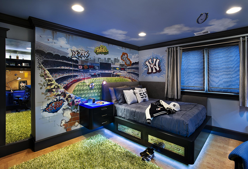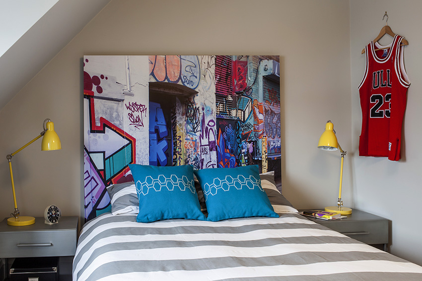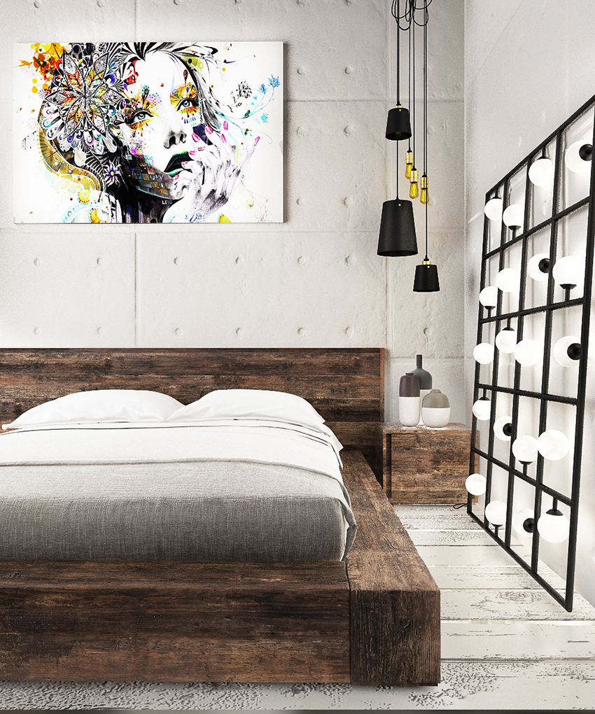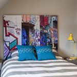- Puede utilizar los resultados de su profesión o afición en el interior. Por ejemplo, en la foto puede ver cómo la imagen se combina armoniosamente con la cama, creando la apariencia de su cabecera.