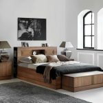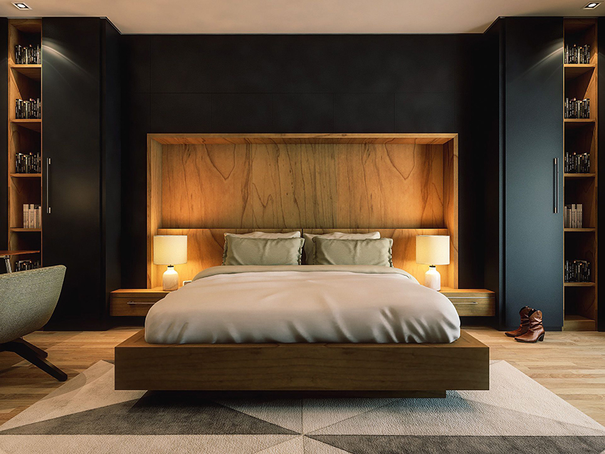 Cama con estantes en el cabecero: diseño práctico y moderno