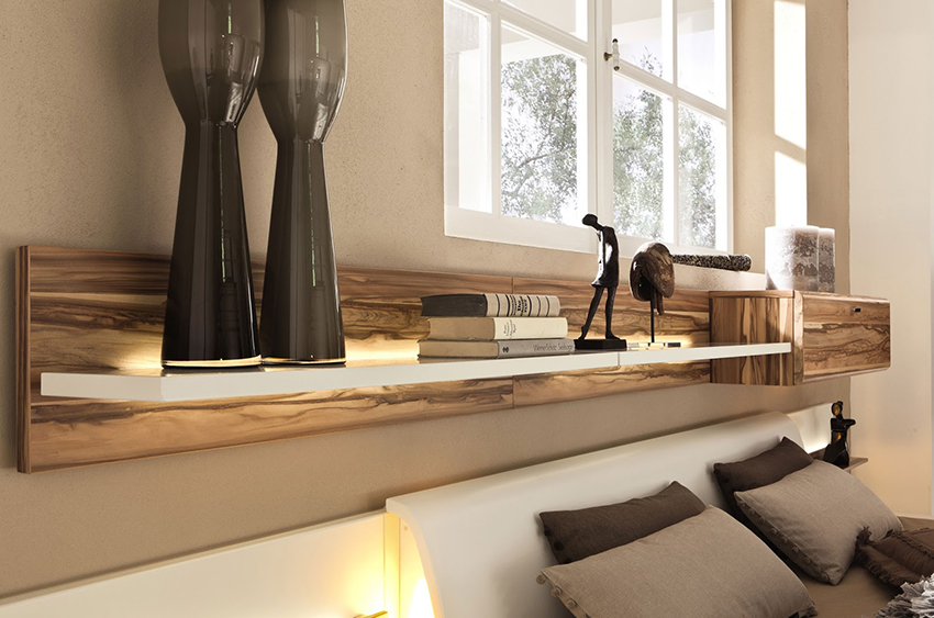 Es mejor dejar abierto el segundo estante, que sirve como función decorativa. Figuras de interior, un par de fotos familiares y lámparas decorativas serán bastante apropiadas en él. Una cama doble con un estante en la cabecera se ve especialmente hermosa, lo que expande visualmente el espacio. Está permitido crear una estantería en un nicho detrás de la cama, pero esta idea arriesgada debe coordinarse con el diseñador para no perder la comodidad del dormitorio.