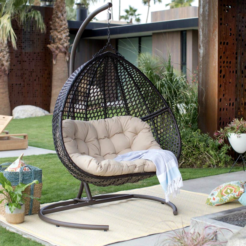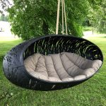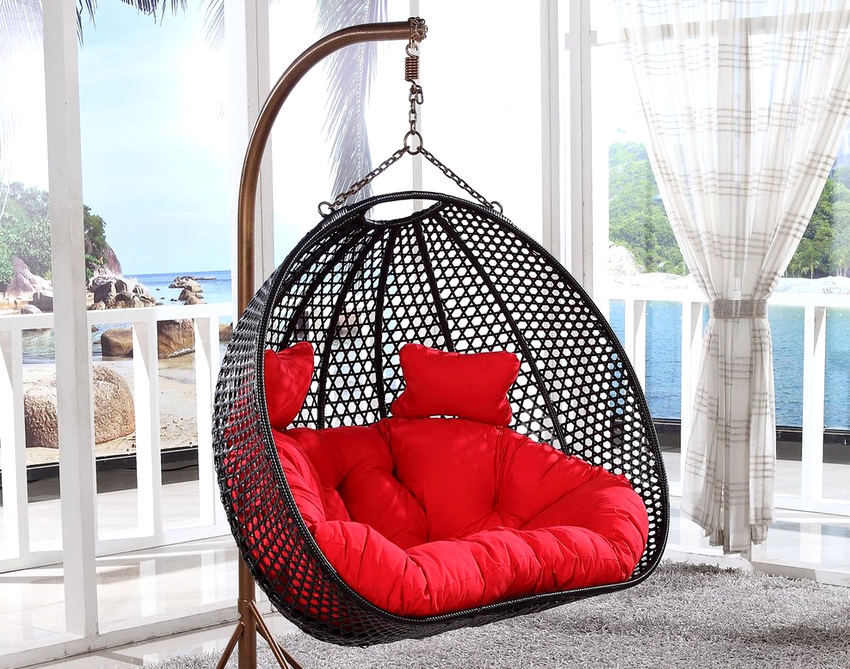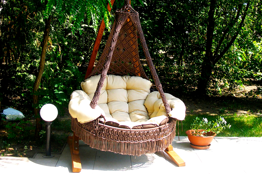 - Practicidad y capacidad para soportar cargas pesadas. La mayoría de las sillas colgantes de ratán están diseñadas para una carga de aproximadamente 120 kg. Los productos fabricados con materiales artificiales o sobre un marco de metal son capaces de soportar un peso de hasta 150 kg, que será suficiente para dos personas de complexión media o para un adulto con un niño.