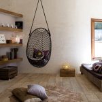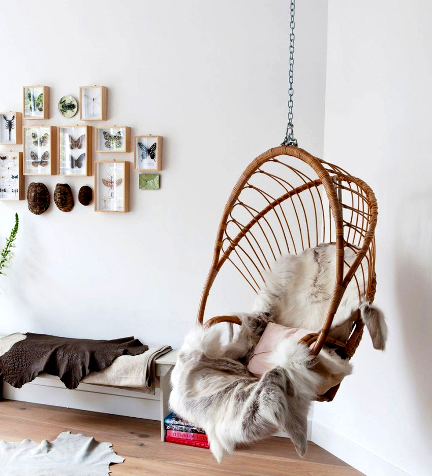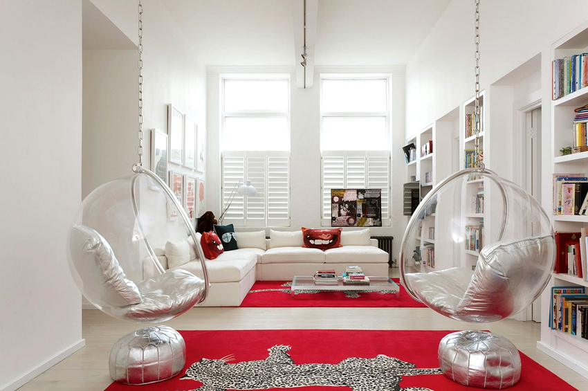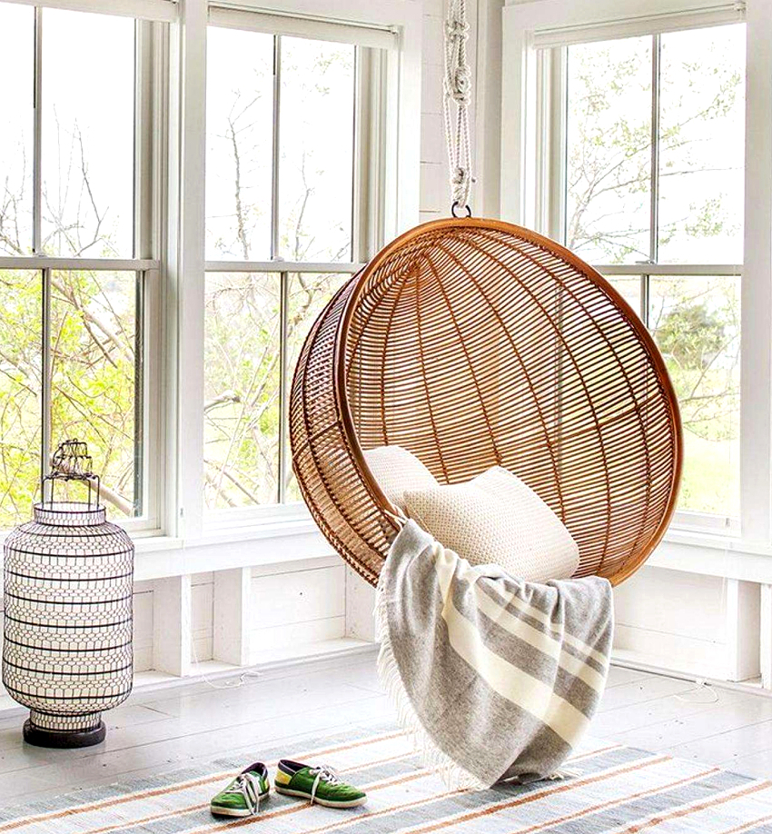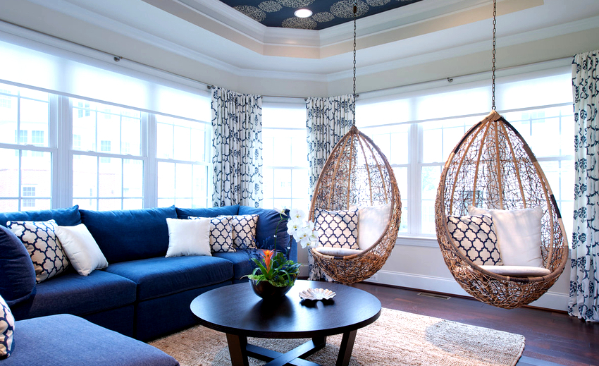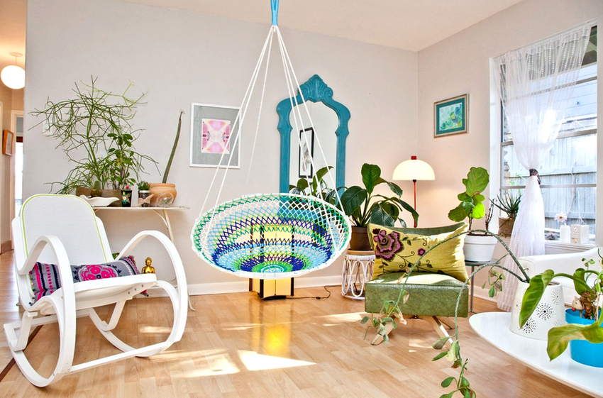 Usando una silla colgante en una habitación, puede crear un diseño inusual donde el producto será el centro de atención. Otra ventaja es la organización de una zona de asientos adicional que no ocupa espacio en el suelo.Dependiendo del tipo de interior, puedes elegir un sillón fabricado con el material que mejor combine con el estilo: