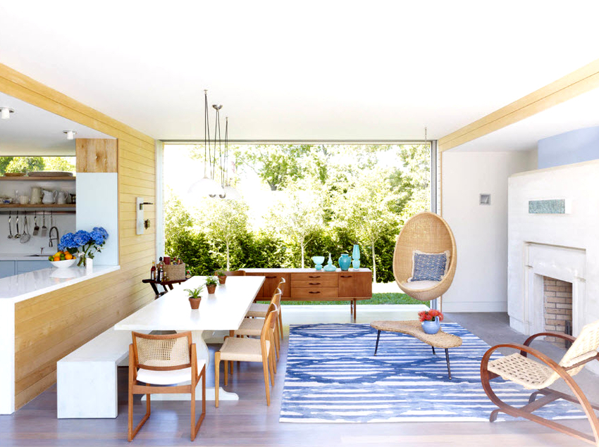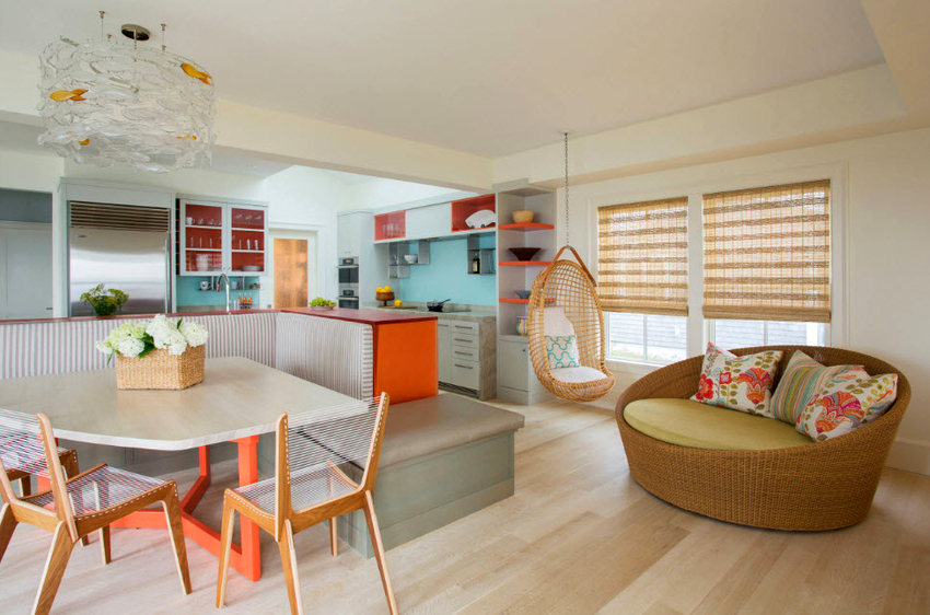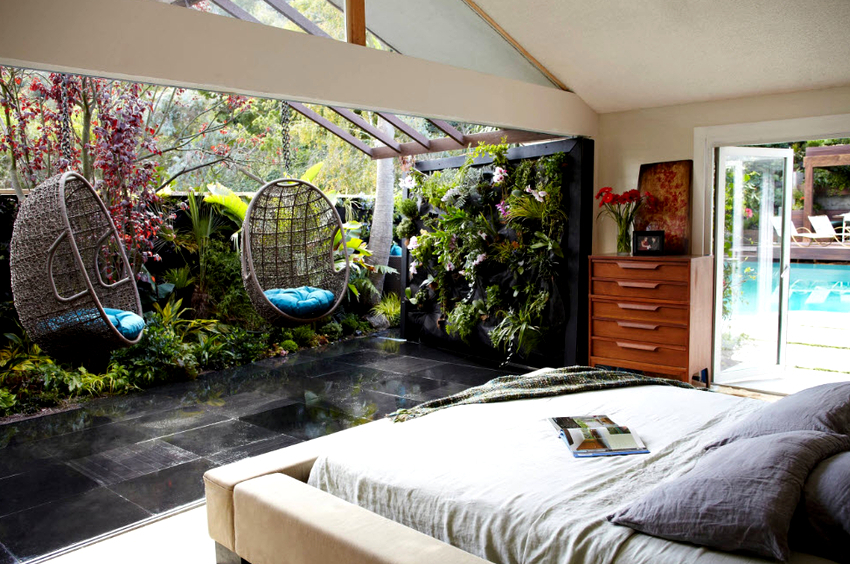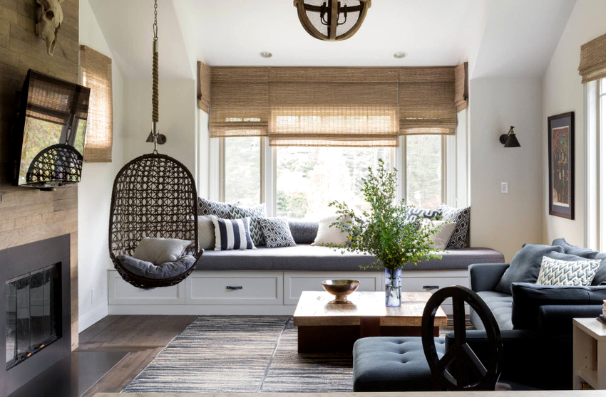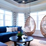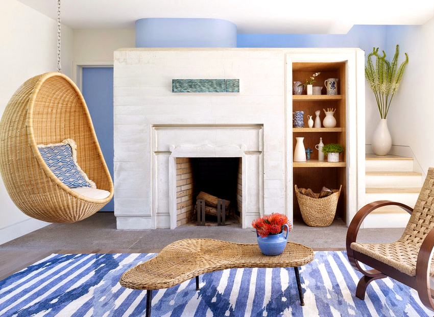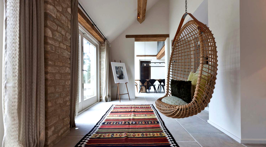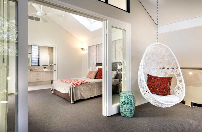 Usando una silla colgante en una habitación, puede crear un diseño inusual donde el producto será el centro de atención. Otra ventaja es la organización de una zona de asientos adicional que no ocupa espacio en el suelo.Dependiendo del tipo de interior, puedes elegir un sillón fabricado con el material que mejor combine con el estilo: