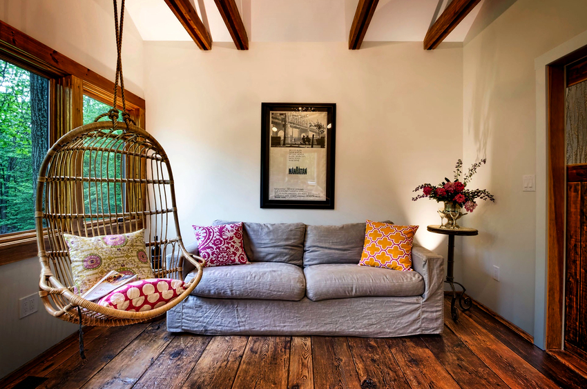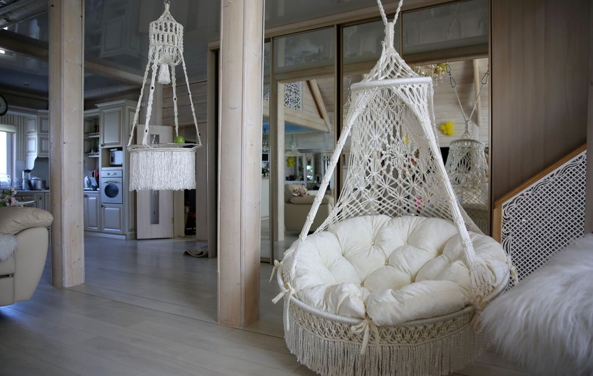 Es mucho más fácil instalar una silla colgante en una habitación que se distingue por la presencia de vigas en el techo. En primer lugar, en este caso, no es necesario estropear la cubierta del techo y, en segundo lugar, la presencia de varias vigas le permite a veces cambiar la posición de los muebles. Otra ventaja es que el producto se puede retirar en cualquier momento sin dejar rastro de presencia, como después de la instalación del techo. Antes de sujetar la silla a la viga, es importante asegurarse de que pueda soportar la carga adicional.