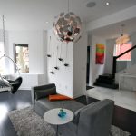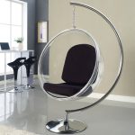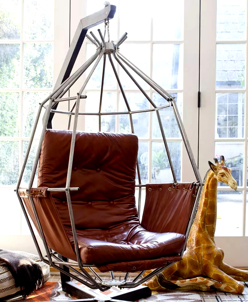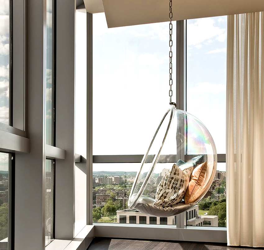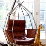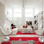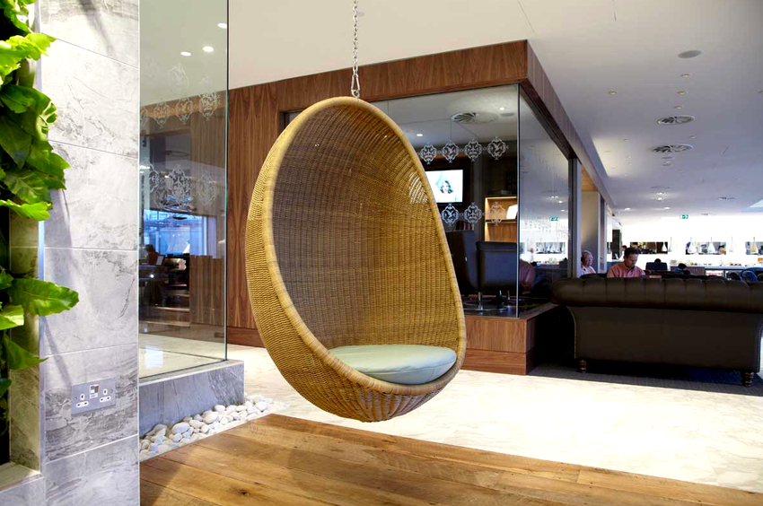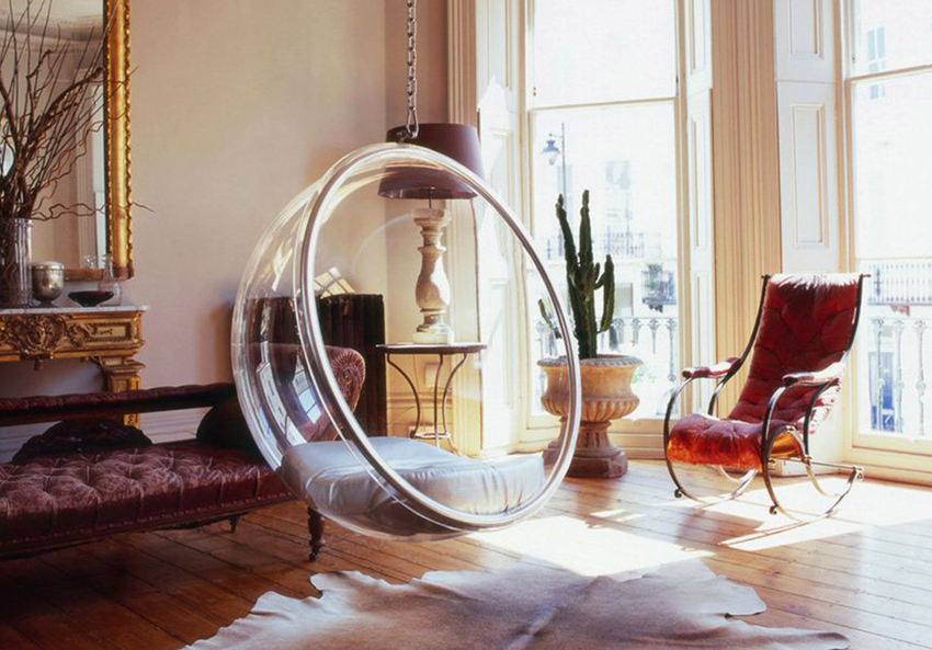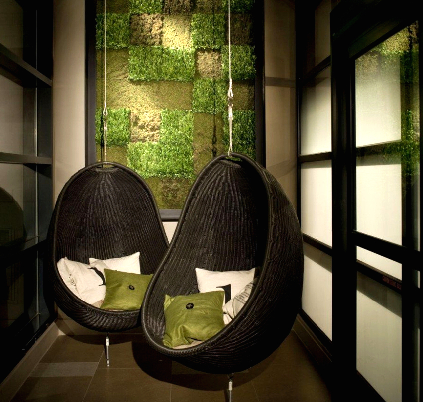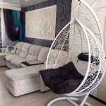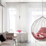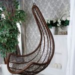 Las sillas colgantes en el interior se ven mucho más impresionantes y crean una sensación de ingravidez en el espacio. Una cadena que cae del techo o un cable largo y delgado, con un enfoque competente, puede convertirse en una parte integral de la habitación y, además de su función principal, desempeñará el papel de un elemento decorativo.