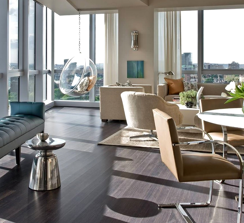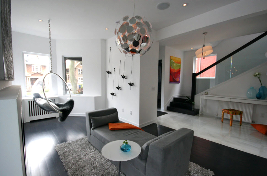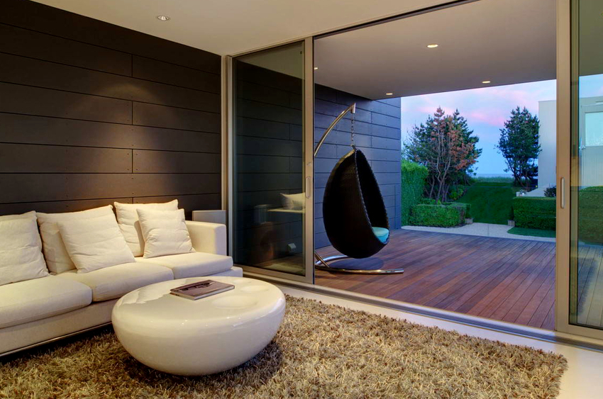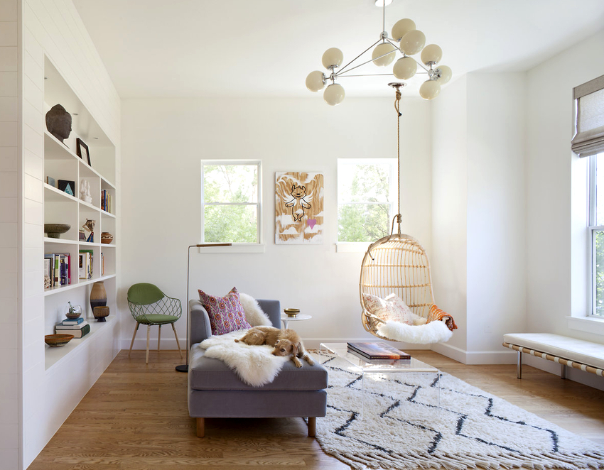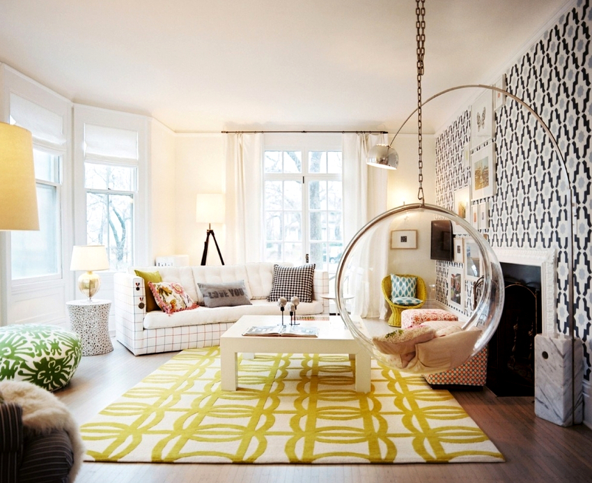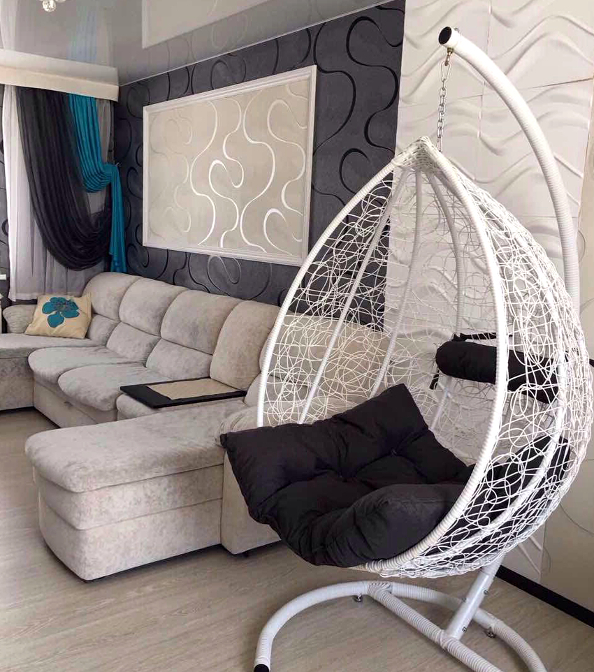 - Sala. En este caso, la silla debe coincidir con el color de los muebles ya instalados aquí. Una silla colgante con una cadena se ve especialmente hermosa en una sala de estar con techo alto.