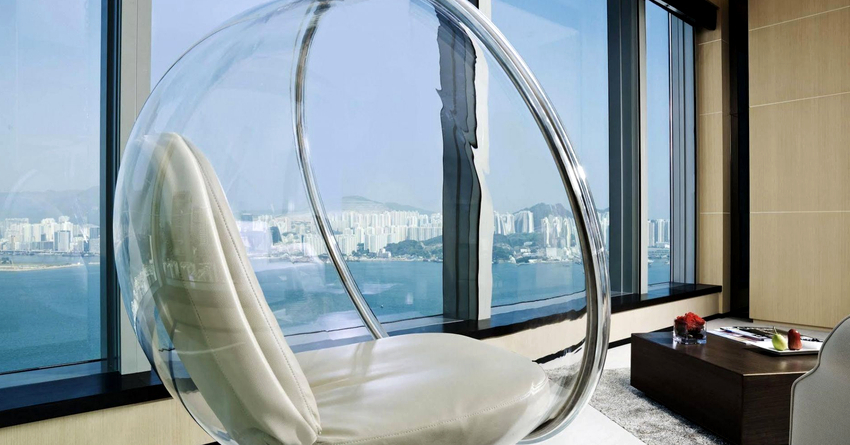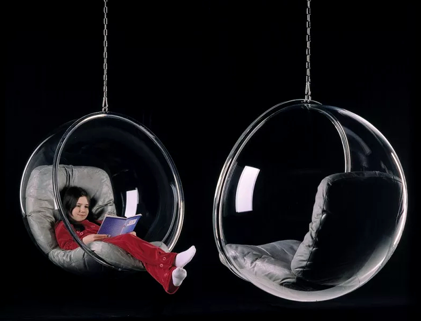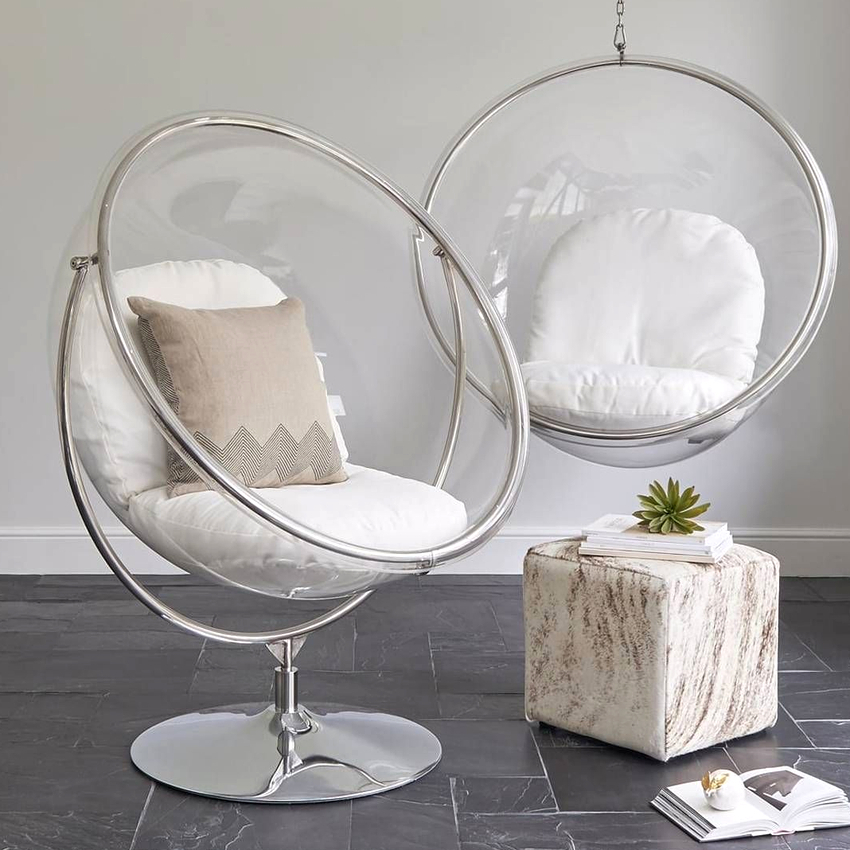 El plastico. El acrílico actúa como material de fabricación. Las sillas están hechas de plástico mate o transparente. Los muebles tienen forma de bola y, a menudo, se pueden encontrar en interiores modernos en estilos techno, high-tech o futurismo. Las principales ventajas del uso son el gran peso para el que están diseñados los productos (unos 200 kg), una larga vida útil.