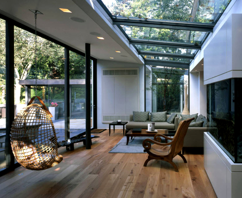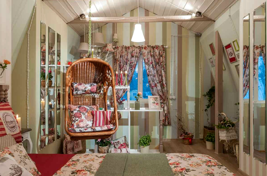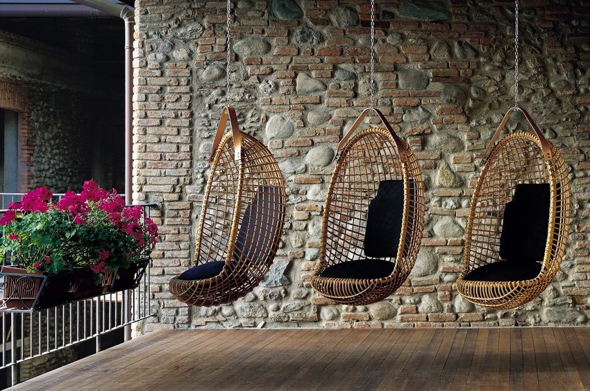 - Veranda. La mayoría de las veces, los productos colgantes se encuentran aquí, porque no hay nada más agradable que relajarse y mecerse en una silla al aire libre en el interior con vistas a un jardín con plantas y flores vivas. Las sillas columpios de ratán en un piso de tablones serán una gran adición a cualquier hogar.