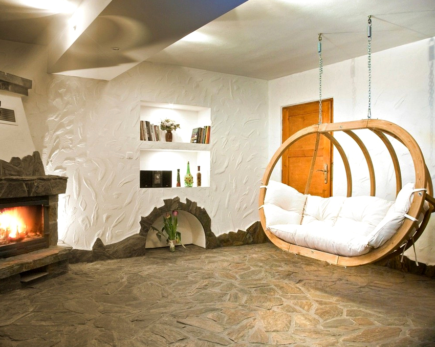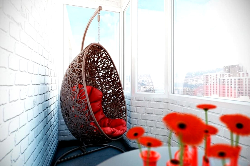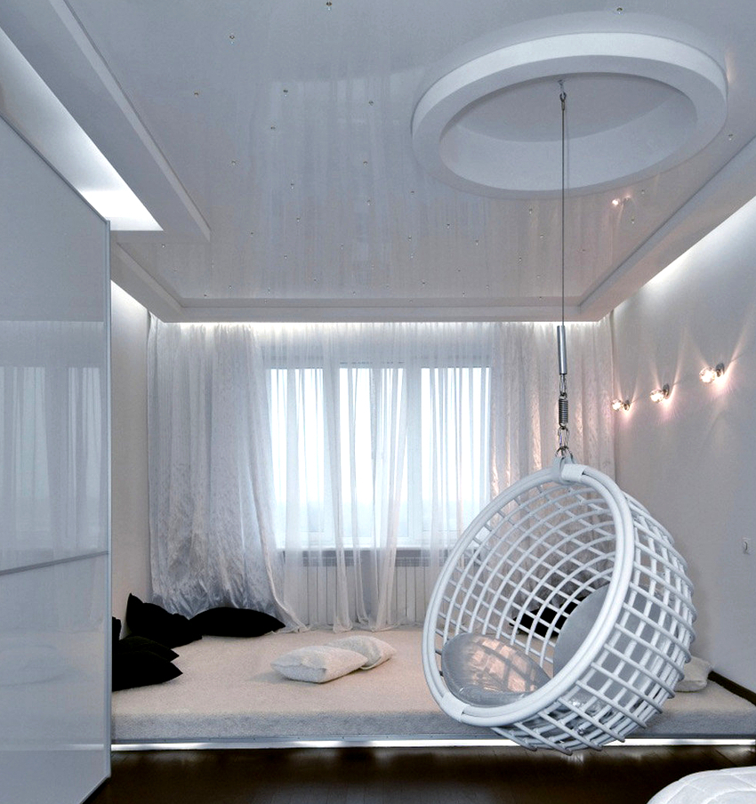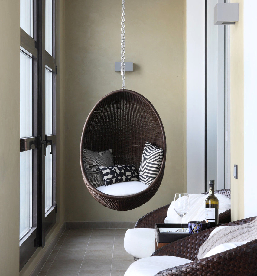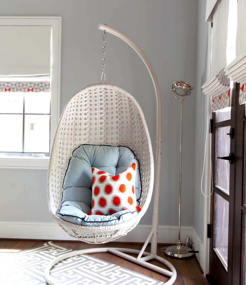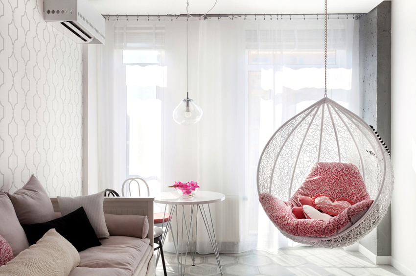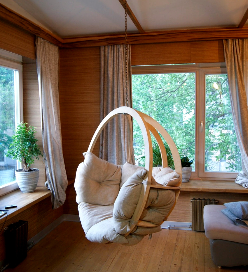 Es mejor planificar el interior de una habitación con una silla colgante incluso durante el proceso de renovación.