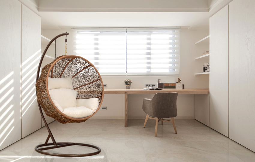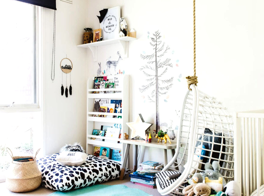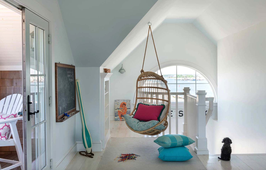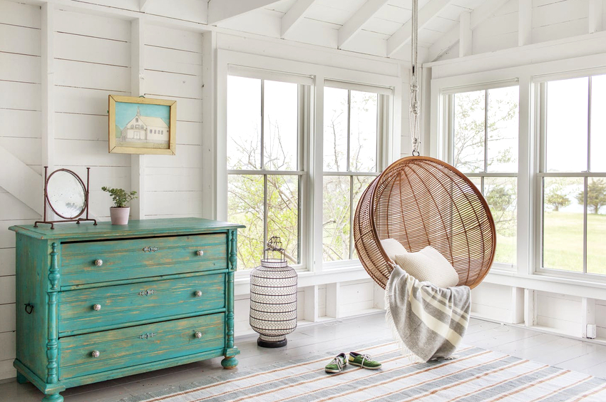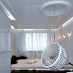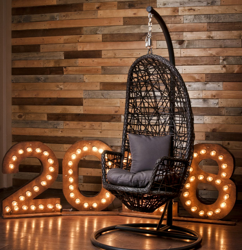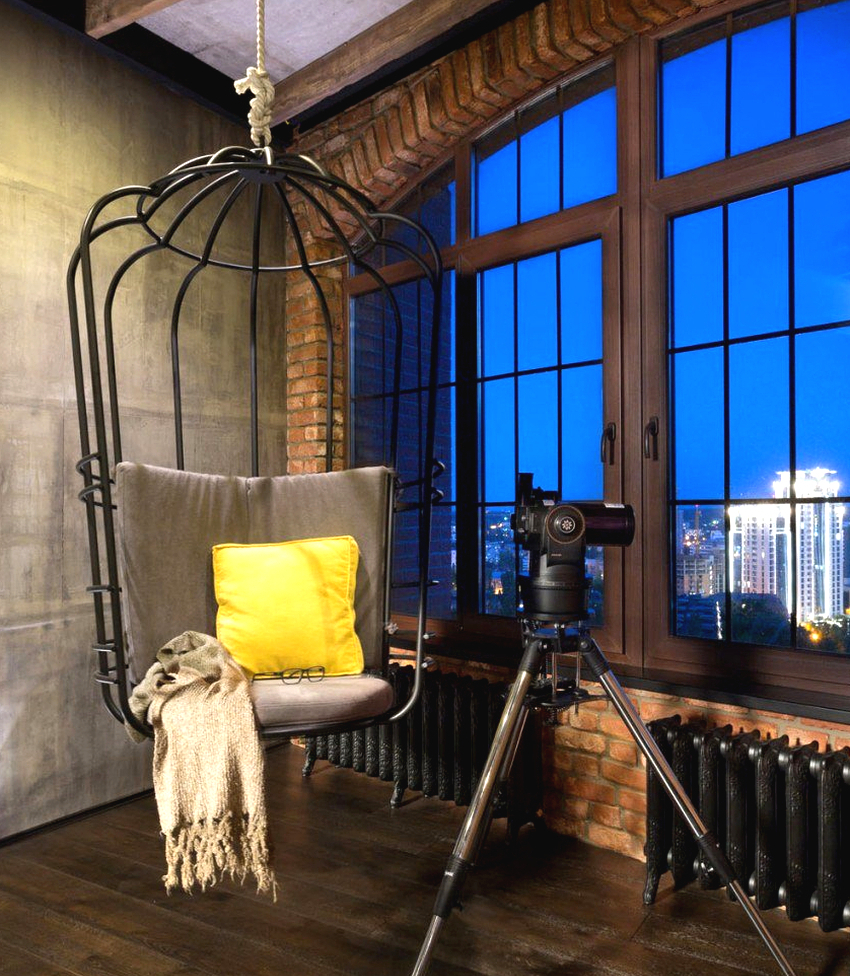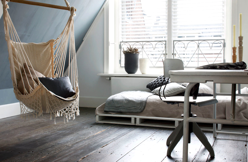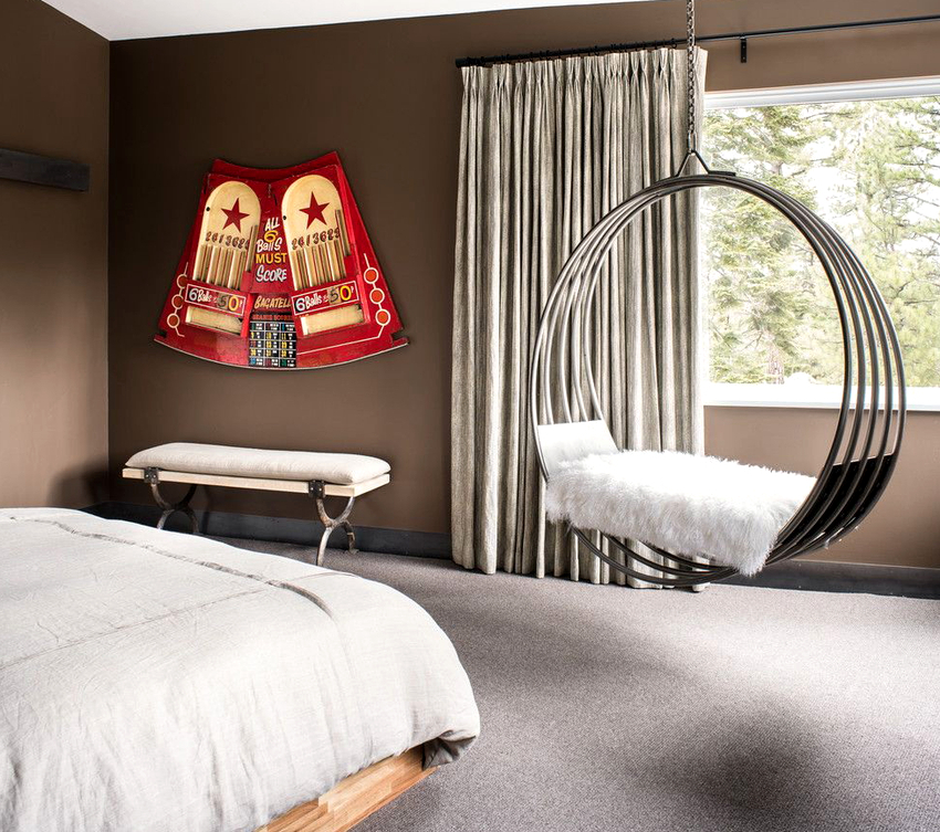 Es mejor planificar el interior de una habitación con una silla colgante incluso durante el proceso de renovación.