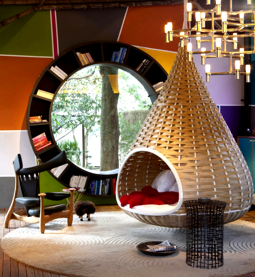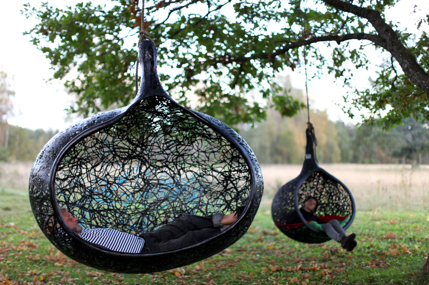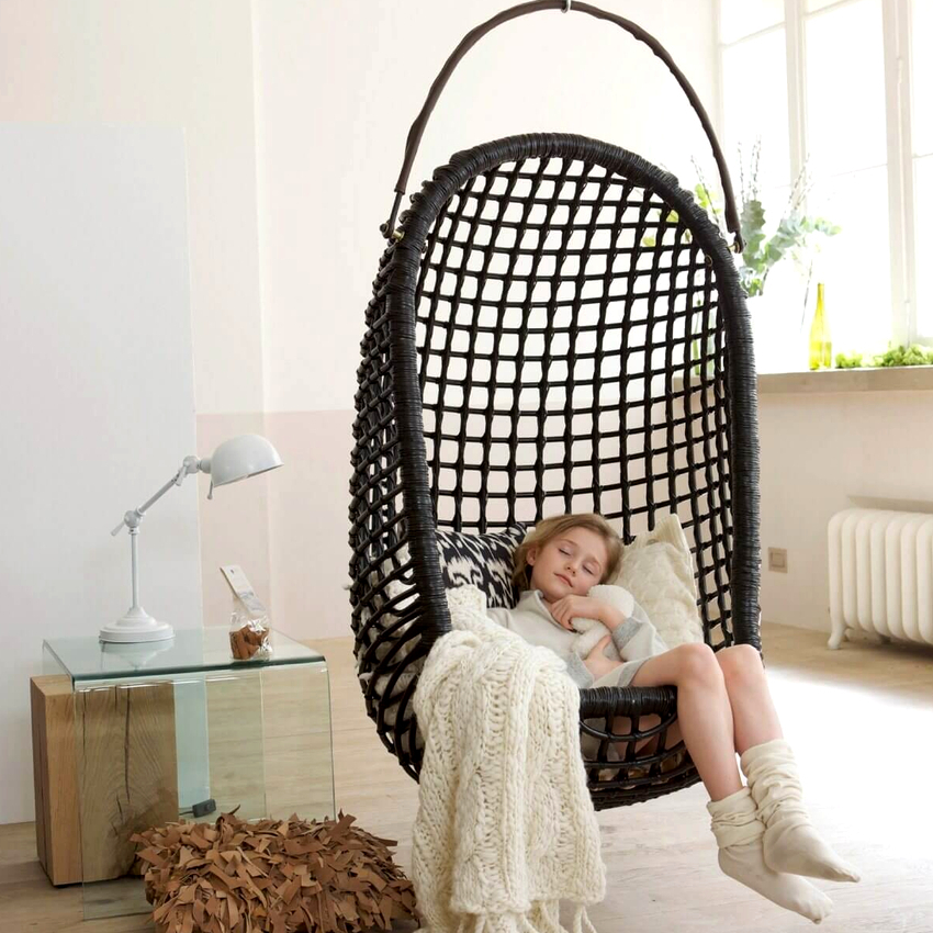 - Capullo. Gracias a las altas paredes laterales, que hacen que el espacio interior esté cerrado y separado, es posible descansar y relajarse en él. Una silla-capullo colgante para bebés servirá como un lugar excelente para mecer a un bebé o descansar a un niño mayor, porque a cualquier edad el estado de suspensión tiene un efecto relajante en una persona. Los capullos de sillas columpios suspendidos se pueden usar armoniosamente en la disposición de cualquier habitación de varios diseños.