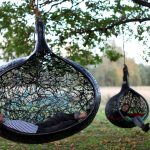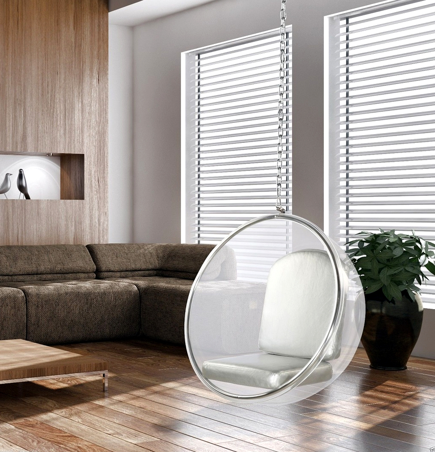 - Huevos de columpio, o, como también se les llama, bolas o nidos. Son llamativos por su forma y apariencia. Se utilizan varios materiales para la producción de este tipo de sillas, la mayoría de las veces vidrio o plástico templado duradero. Se ve bien en interiores ultramodernos como el minimalismo o la alta tecnología.