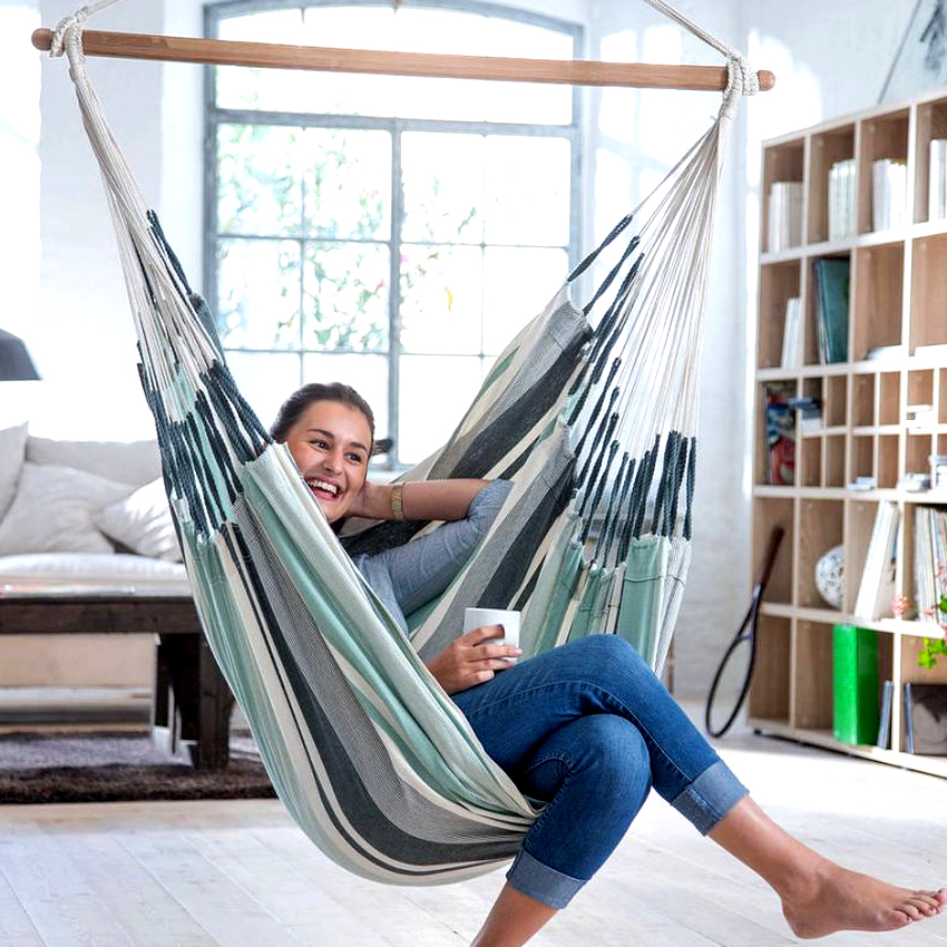 - Un peso ligero. En promedio, el peso de una mecedora para un apartamento no supera los 20 kg, por lo que no habrá una carga adicional excesiva en las vigas del techo. Sin embargo, a la hora de instalar, es importante tener en cuenta el peso de la persona que lo utilizará, y debes adquirir el producto teniendo en cuenta la carga máxima para la que está diseñado. La silla hamaca colgante para bebés está compuesta principalmente de textiles y pesa hasta 5 kg.