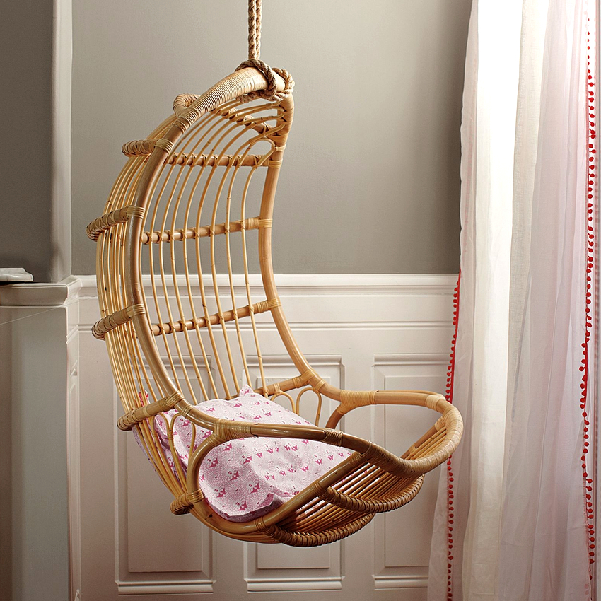 La ventaja de una silla colgante de mimbre es que se puede usar en el patio, en la terraza o incluso en el balcón.