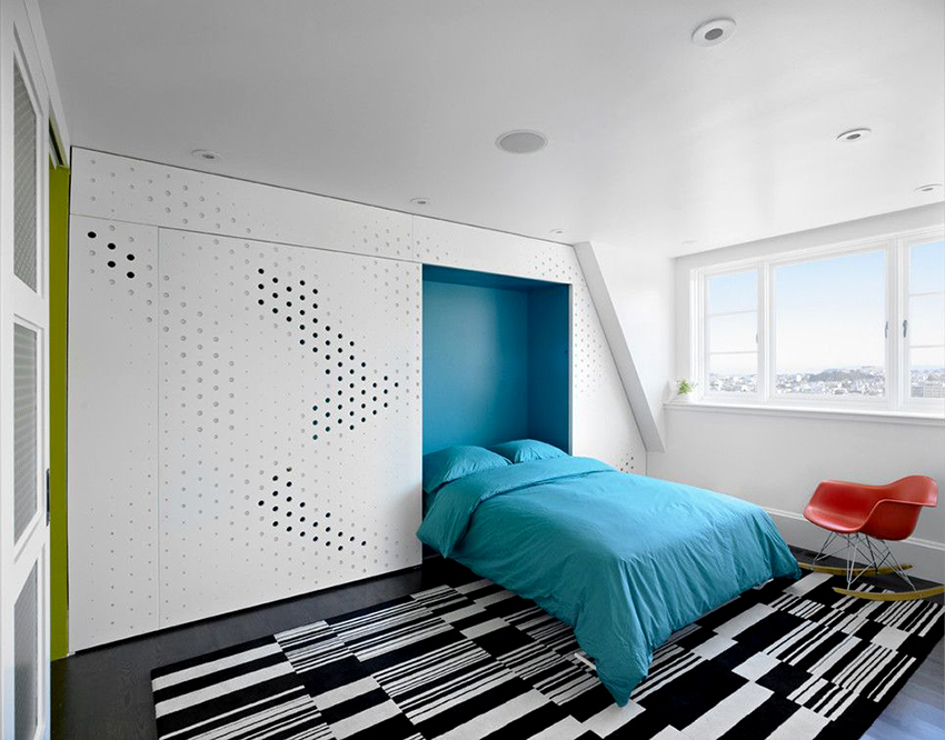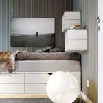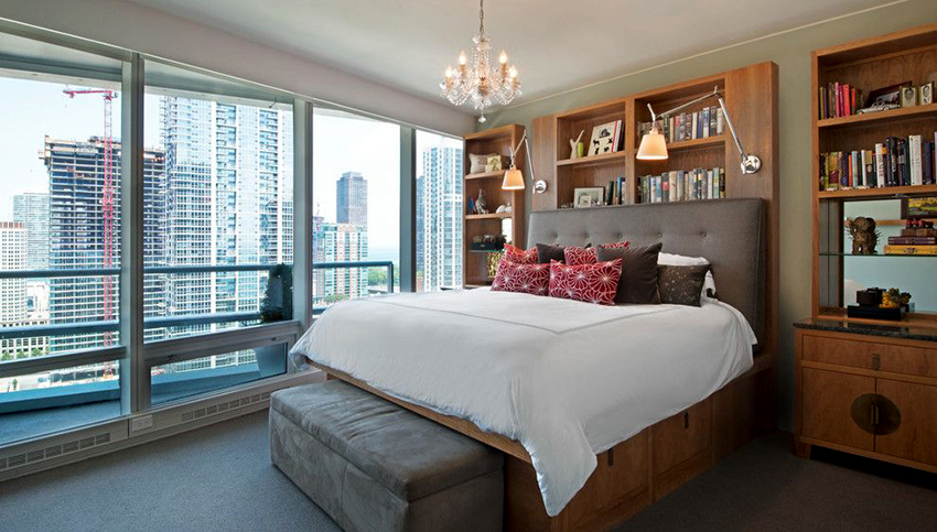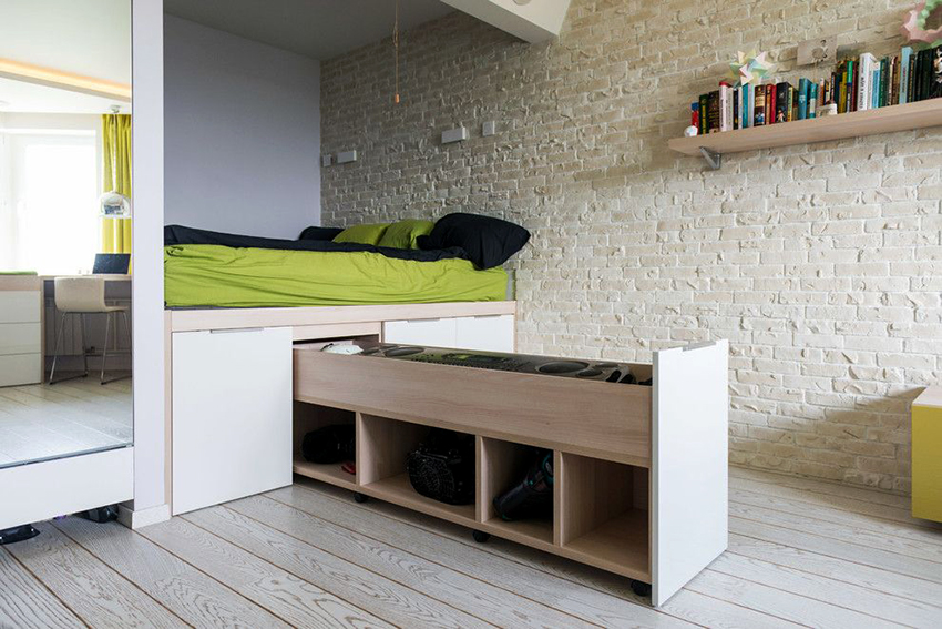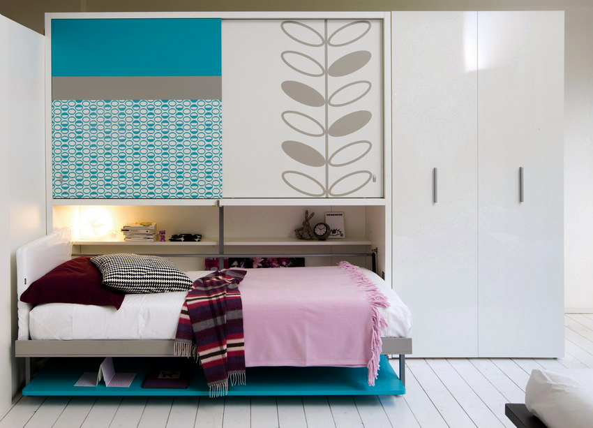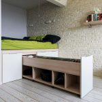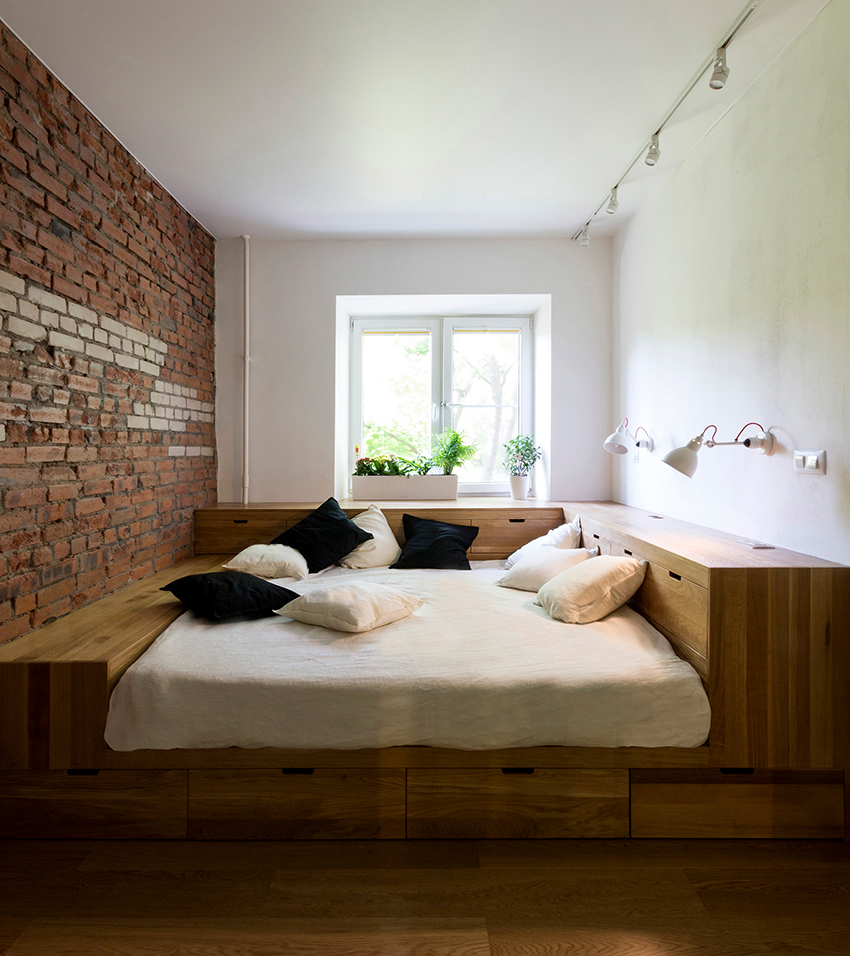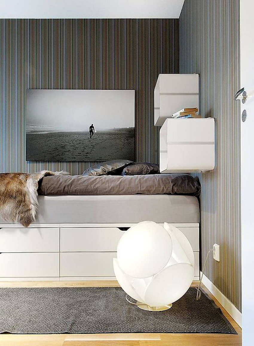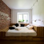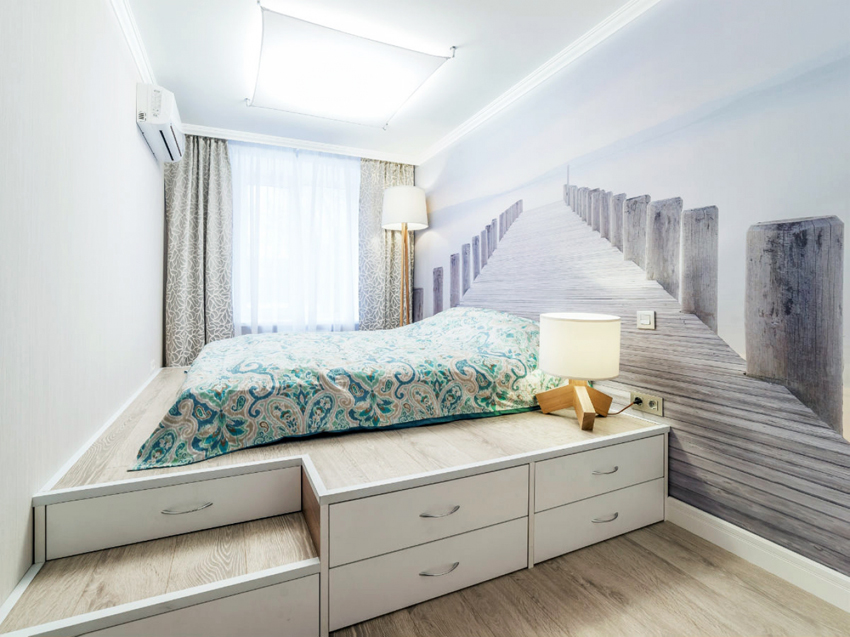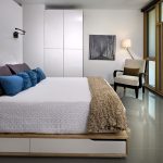 La última opción de diseño a menudo se instala en habitaciones pequeñas, donde es importante usar racionalmente cada centímetro de espacio. Aquí puede equipar un amplio sistema de almacenamiento en la zona de la cama.