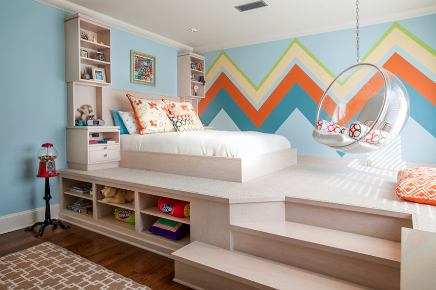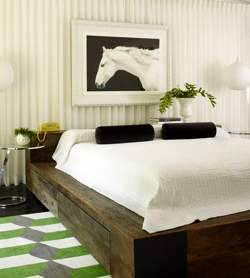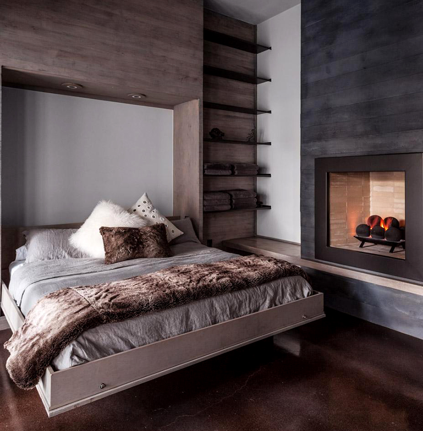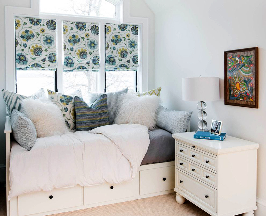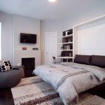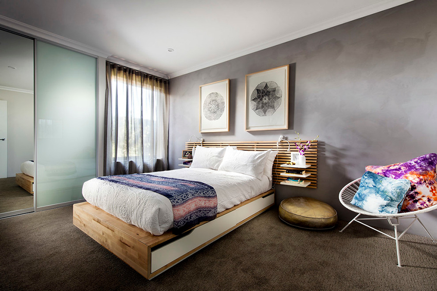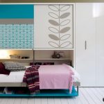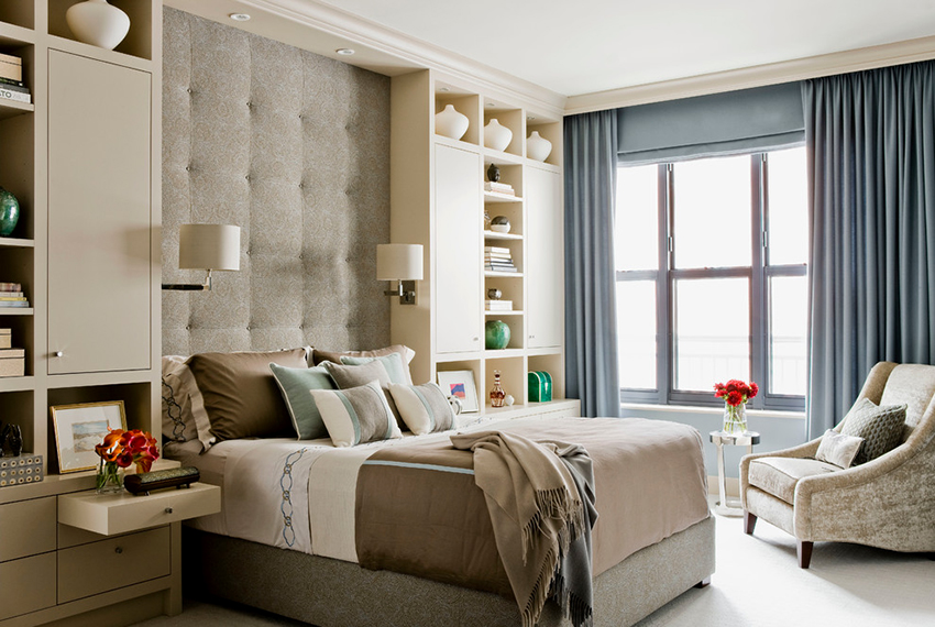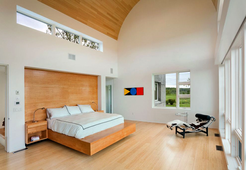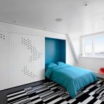 La última opción de diseño a menudo se instala en habitaciones pequeñas, donde es importante usar racionalmente cada centímetro de espacio. Aquí puede equipar un amplio sistema de almacenamiento en la zona de la cama.