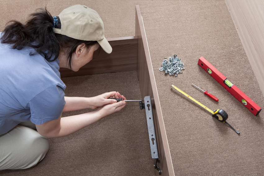 A continuación, el mecanismo de elevación y los resortes de gas se unen a los lados del gabinete. El primer elemento se conecta al marco de la cama. Para fijar los elementos, es muy importante usar pernos fuertes que le permitan atornillar cuidadosamente las partes entre sí, ya que este lugar soportará cargas máximas.