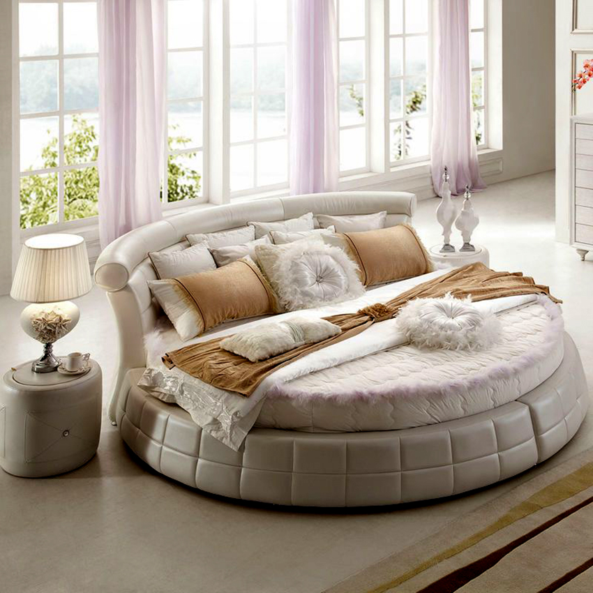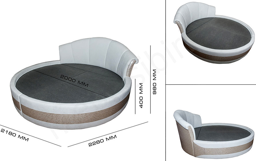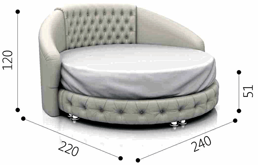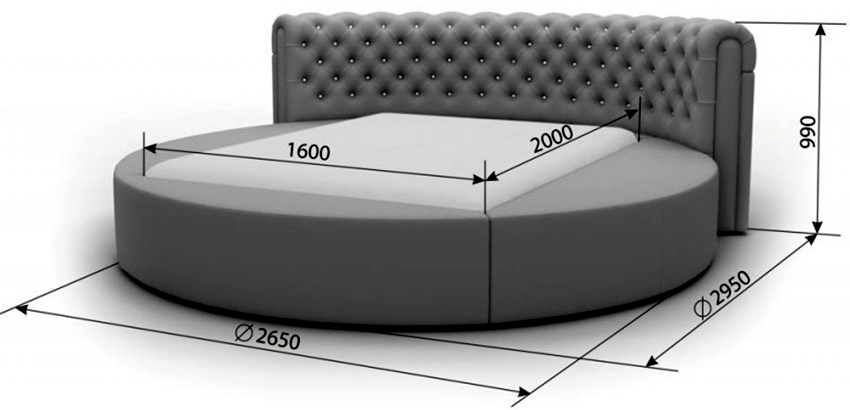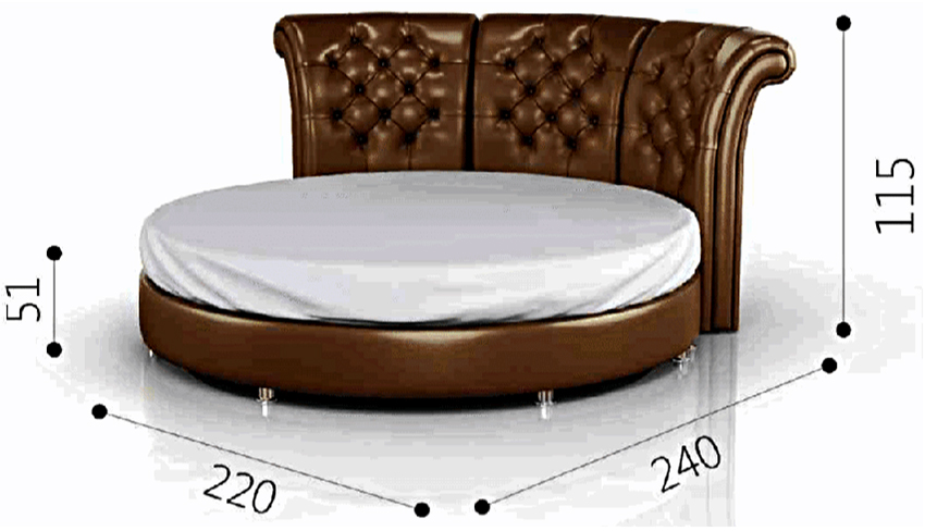 La cama puede ser no solo rectangular, sino también redonda. El tamaño estándar de dicho producto es de 220 cm de diámetro.