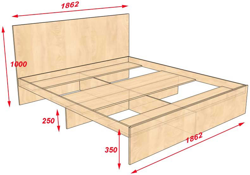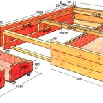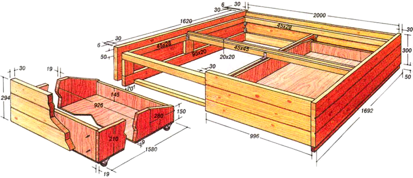 Usando el dibujo de una cama de madera con sus propias manos, los cajones, las paredes laterales, la cabecera y la parte inferior de los cajones están hechos de aglomerado o MDF. El marco de la base está hecho de bloques de madera. Se adjunta la parte inferior de las cajas. Los cajones y los elementos laterales se instalan en el marco, sobre los cuales se coloca el piso de rejilla debajo del colchón. En la base se fija una cabecera de aglomerado.