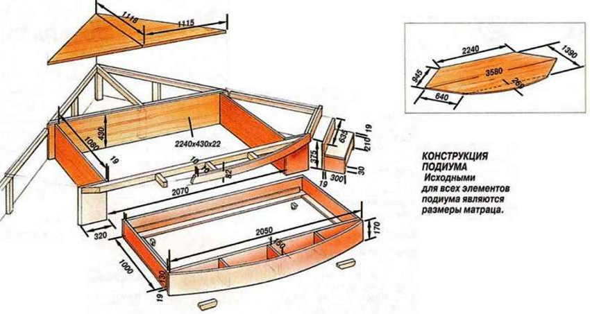 Si la cama se saca del podio, el aglomerado no es adecuado como material para la fabricación, ya que la estructura estará sujeta a una tensión significativa. En este caso, se crea un revestimiento rugoso de OSB o madera contrachapada gruesa, que se enfunda en la parte superior con laminado, alfombra u otro material. La madera contrachapada se fija al marco con tornillos autorroscantes.