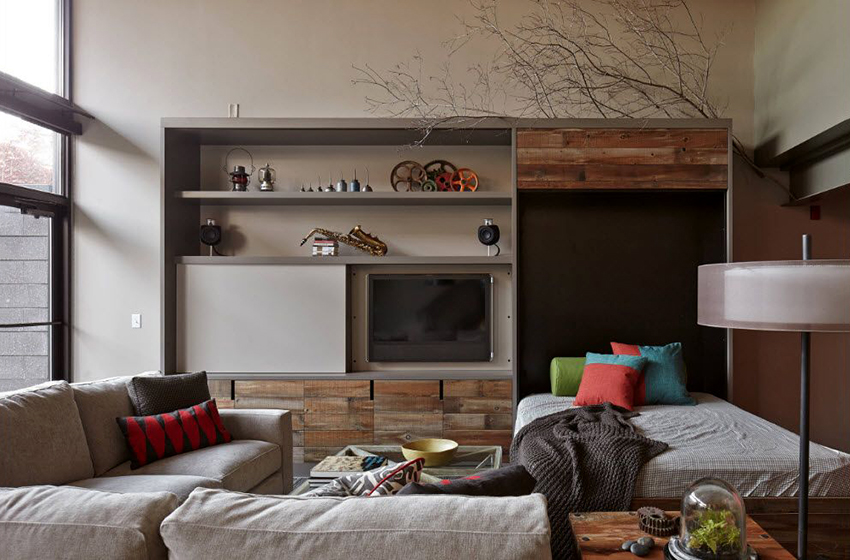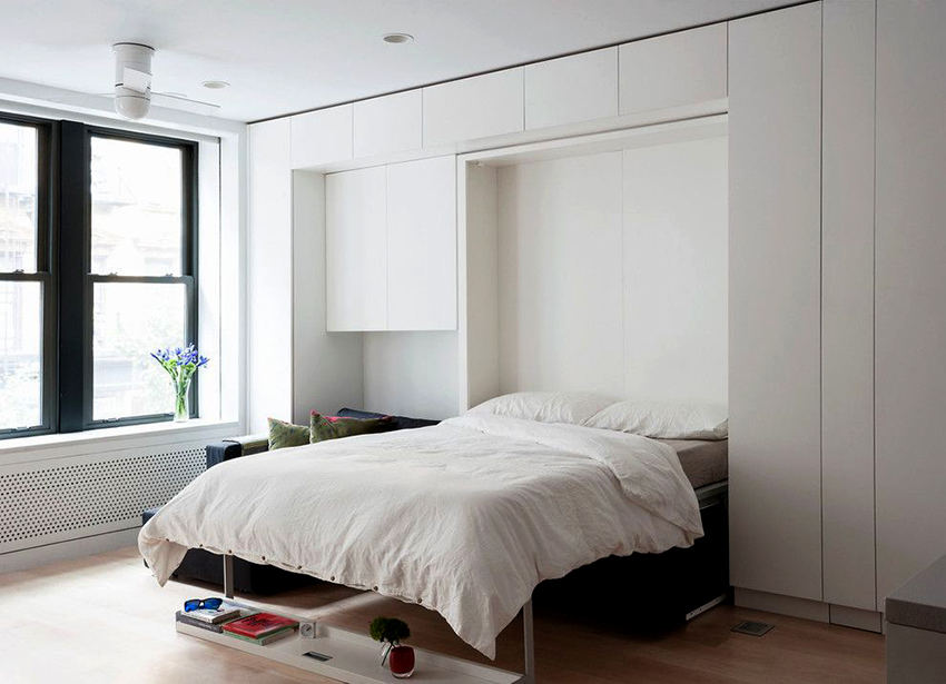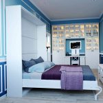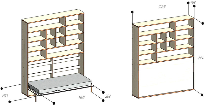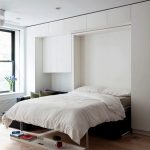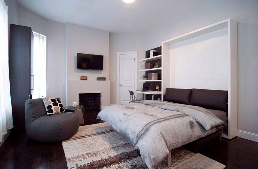 La cama de armario de bricolaje en casa tiene un aspecto inusual. La cama se guarda en un almacenamiento especial que no se puede ver desde un lado. Este modelo le permite ahorrar totalmente espacio libre, ya que la estructura ensamblada es parte del gabinete y no ocupa espacio.