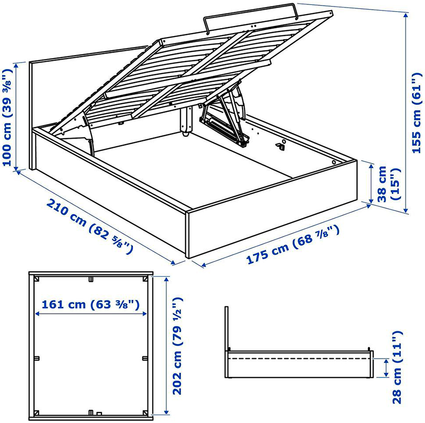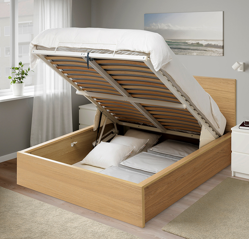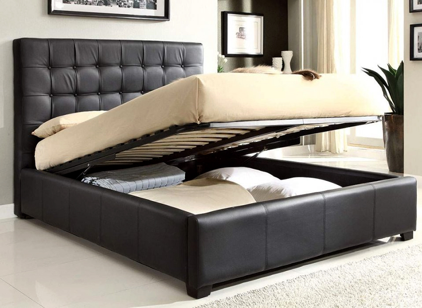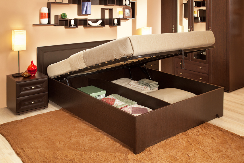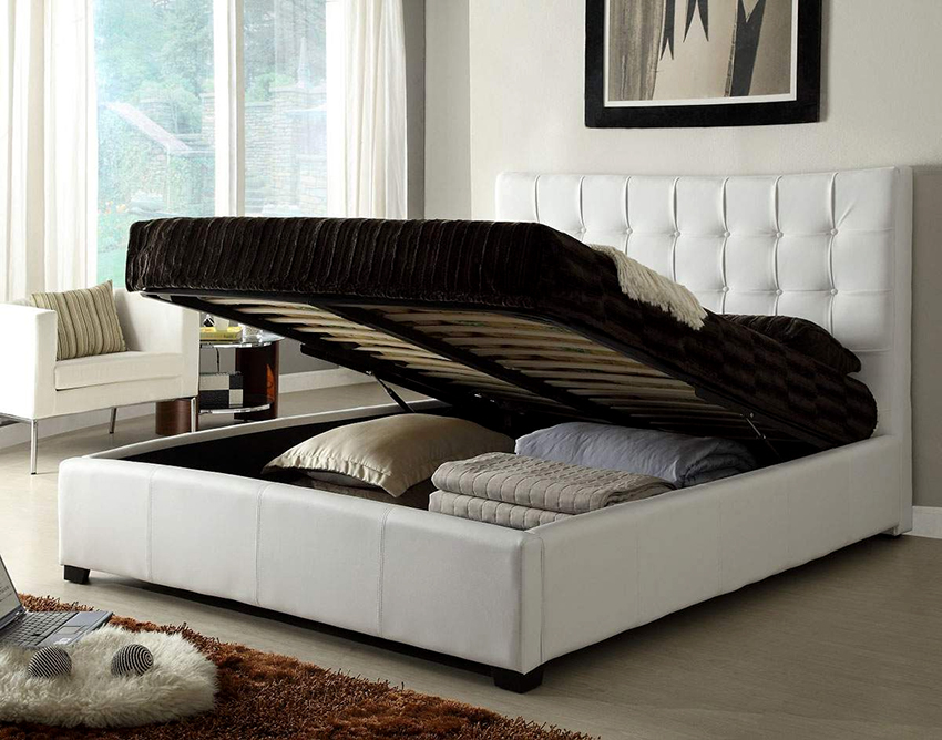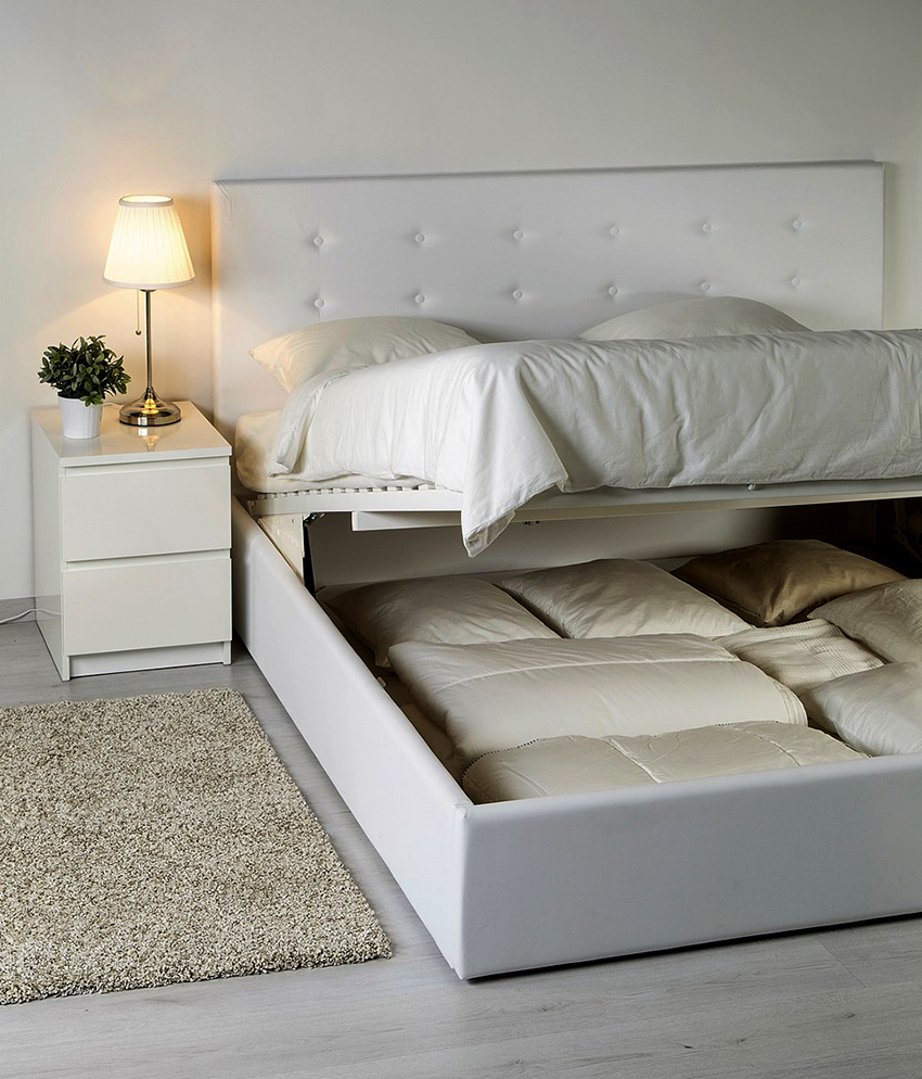Si el producto descansa sobre las paredes laterales, generalmente hay cajas de almacenamiento debajo del colchón. Se pueden sacar del lado de la estructura, o el espacio de almacenamiento se abre levantando el colchón desde el lado de los pies. Este mecanismo se llama elevación de gas.