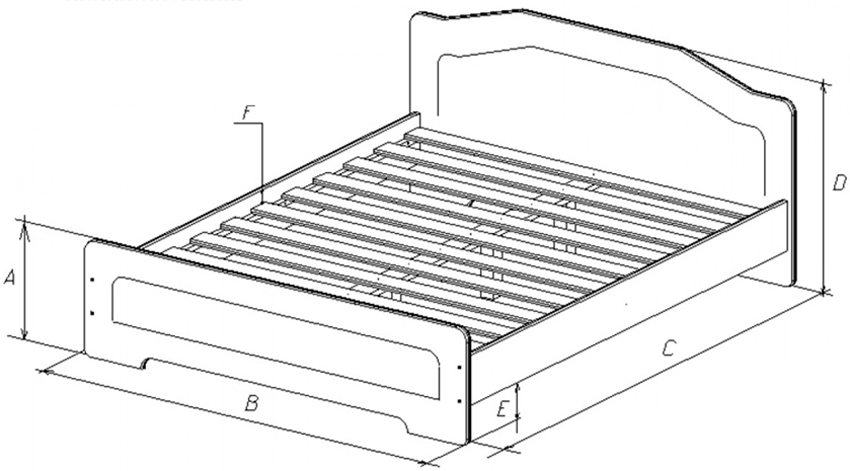 Dibujo de una cama individual, donde A - 50 cm, B - 98 cm, C - 211 cm, D - 66 cm, E - 21,5 cm, F - 7,5 cm