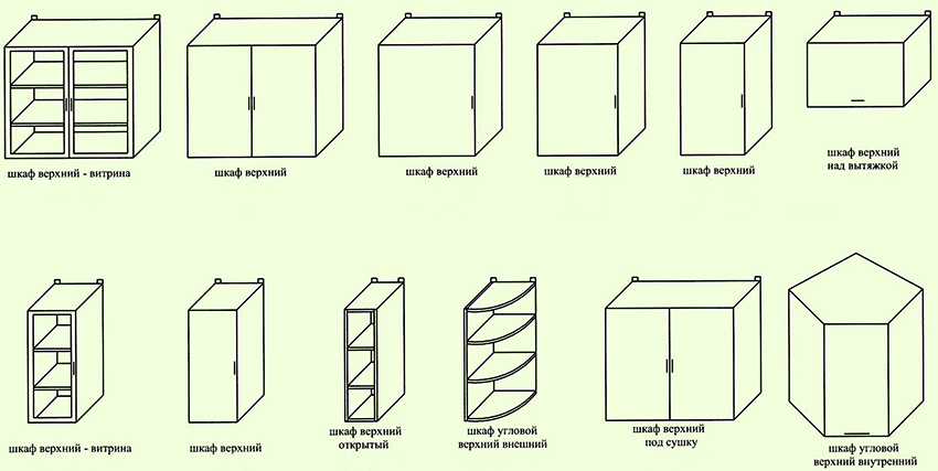 Sobre el fregadero, como regla, se instala un gabinete con secadora. Se trata de una rejilla especial en forma de rejilla con compartimentos para platos y bandeja para agua, sobre la que se secan platos, tazas y vasos.Una categoría separada de gabinetes de pared se compone de diseños con campana incorporada, así como modelos de esquina bastante populares y espaciosos.