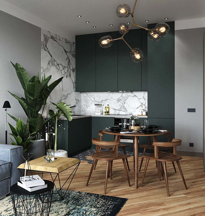 Hay modelos que se cubren con una mampara o persianas enrollables. Estas opciones son perfectas para organizar la vida de un estudiante o la casa de un soltero. Los materiales más utilizados para la fabricación son tableros de MDF con revestimiento laminado o barnizado en alianza con una encimera de metal o piedra. Los modelos más baratos están hechos de aglomerado. La gama de colores de las fachadas es bastante amplia, lo que le permite colocar el gabinete de la cocina en casi cualquier interior.