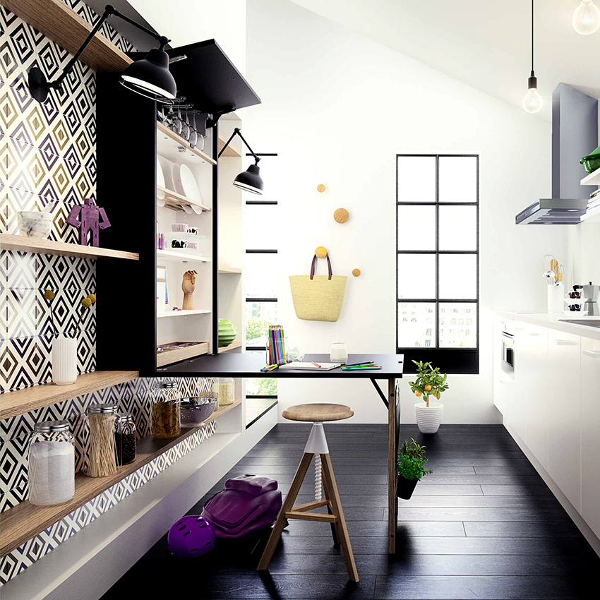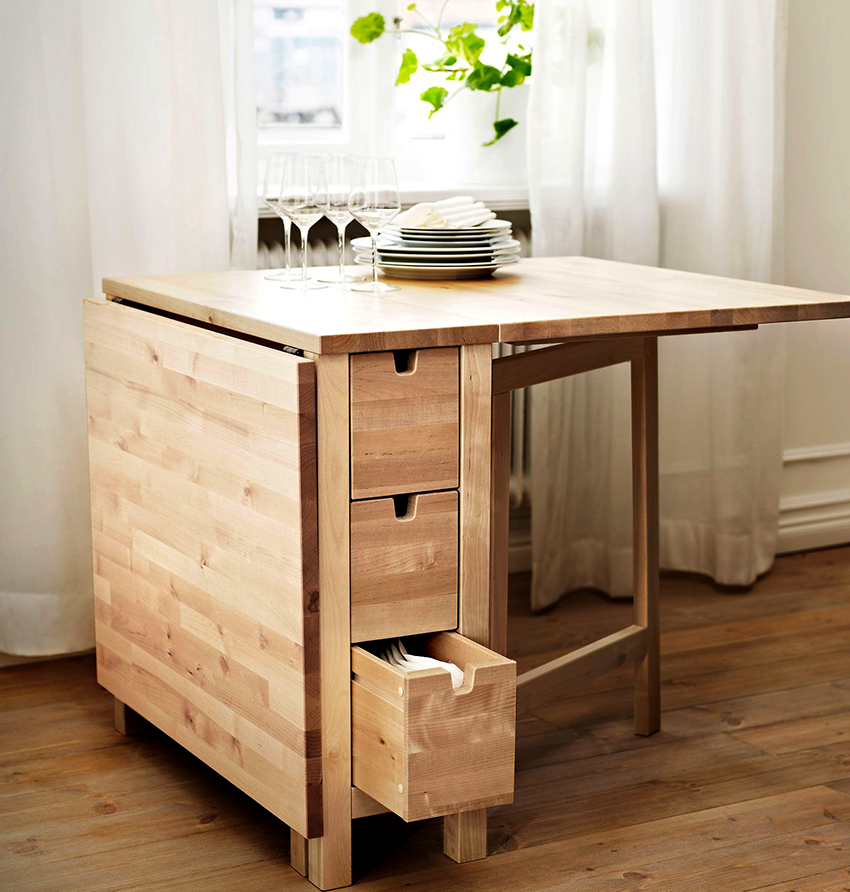 En los últimos 10 años, los llamados apartamentos inteligentes con un área pequeña y una cocina-estudio han ganado popularidad. En tales condiciones, es necesario zonificar claramente y ahorrar espacio. Una mesa plegable compacta para la cocina en la vida cotidiana no ocupa mucho espacio y, en vacaciones, ampliará el círculo de invitados.