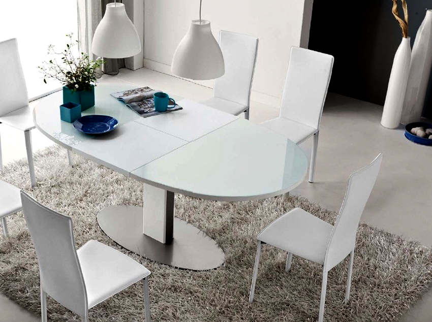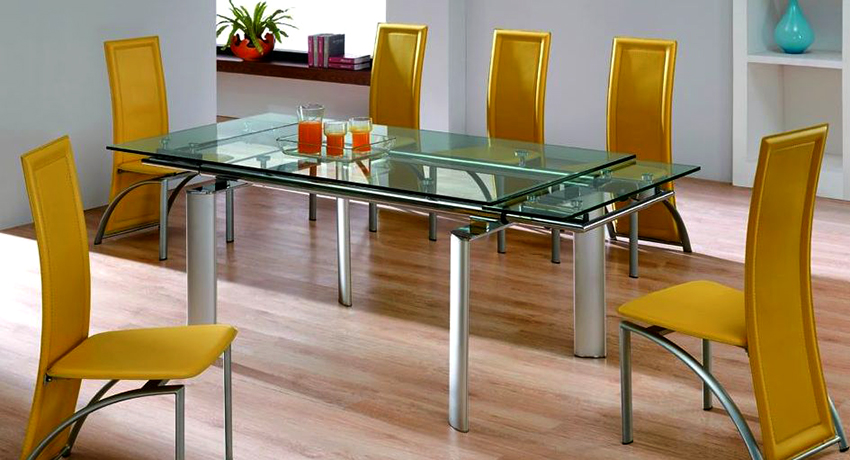Las mesas de comedor corredizas de vidrio para la cocina ayudarán a convertir en realidad cualquier idea de diseño. Adecuado para interiores en loft, art deco y género de alta tecnología. Siempre lucen originales y hermosos. Lo principal es utilizar vidrio con una estructura templada de alta resistencia en la producción.