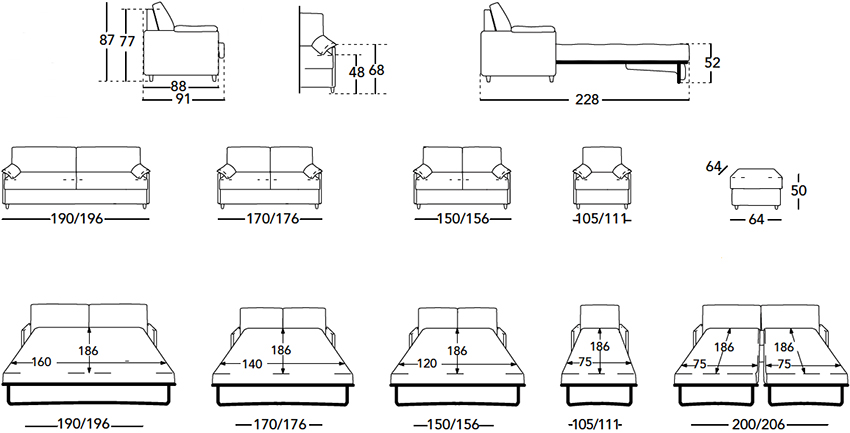 Tamaños estándar de sofás con el mecanismo de transformación Eurobook