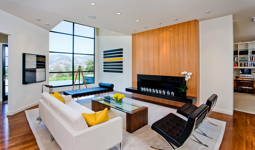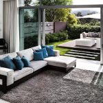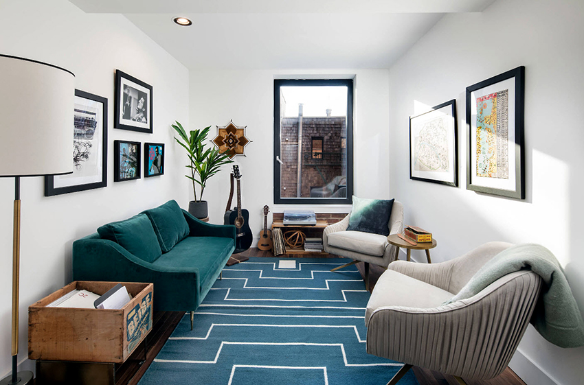 En una sala de estar rectangular con una gran diferencia de lados, no debe comprar una estructura angular. Más aceptables son dos sofás rectos idénticos de 180-190 cm de largo y 80-90 cm de ancho, que se pueden instalar en paralelo (si el área de la habitación lo permite) o en forma de L con un espacio libre obligatorio en el lugar de la conexión condicional.