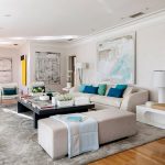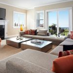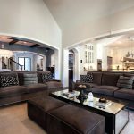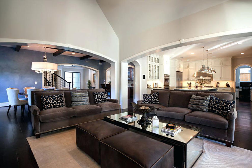 Los sofás en forma de U para la sala de estar son especialmente lujosos y atractivos. Estas son opciones solo para habitaciones más grandes. En este caso, la distancia entre los lados paralelos debe ser tal que se pueda colocar una mesa dentro de la estructura del sofá (si está ausente o se instala fuera del sofá, no servirá para equipar una zona de asiento cómoda).