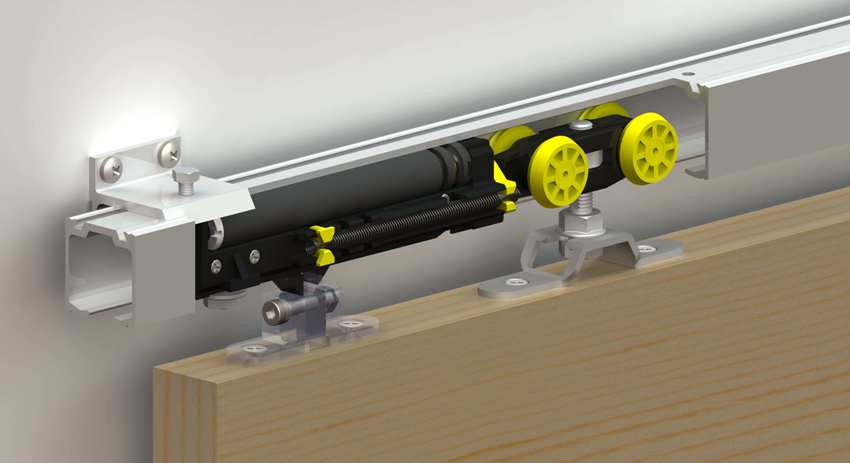 El enganche es la única opción con un perfil superior. Emite un sonido desagradable y tampoco es muy estable. Para mover las solapas, debe hacer un esfuerzo. Solo existe una versión superior que se puede fijar al techo. No debe usarse para el dormitorio. El mecanismo de suspensión consta de dos guías y se fija al marco desde el interior. La carga se distribuye aproximadamente a la mitad, lo que hace que la puerta se incline.
