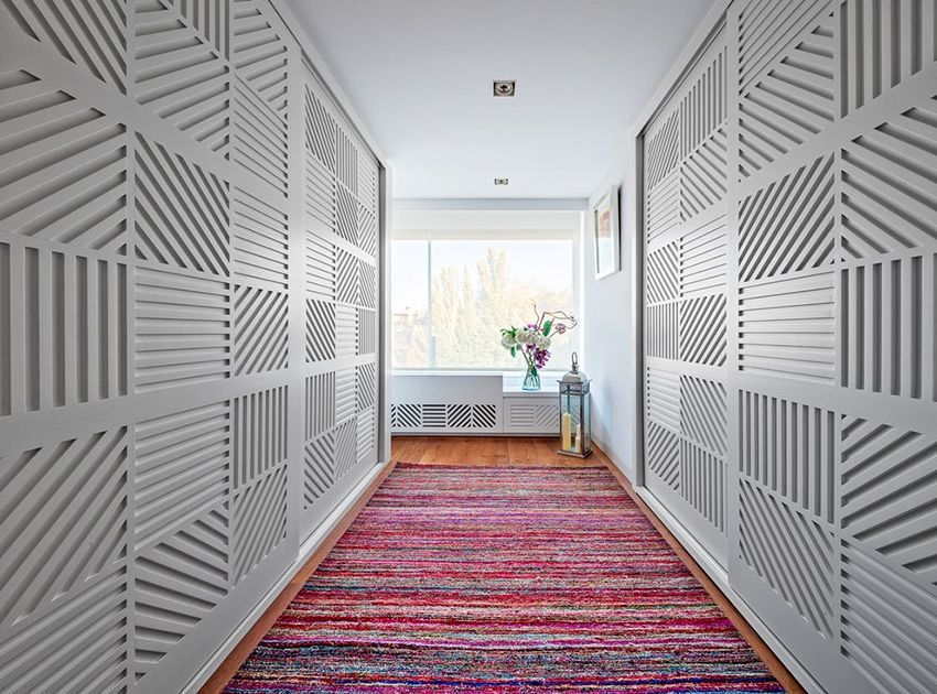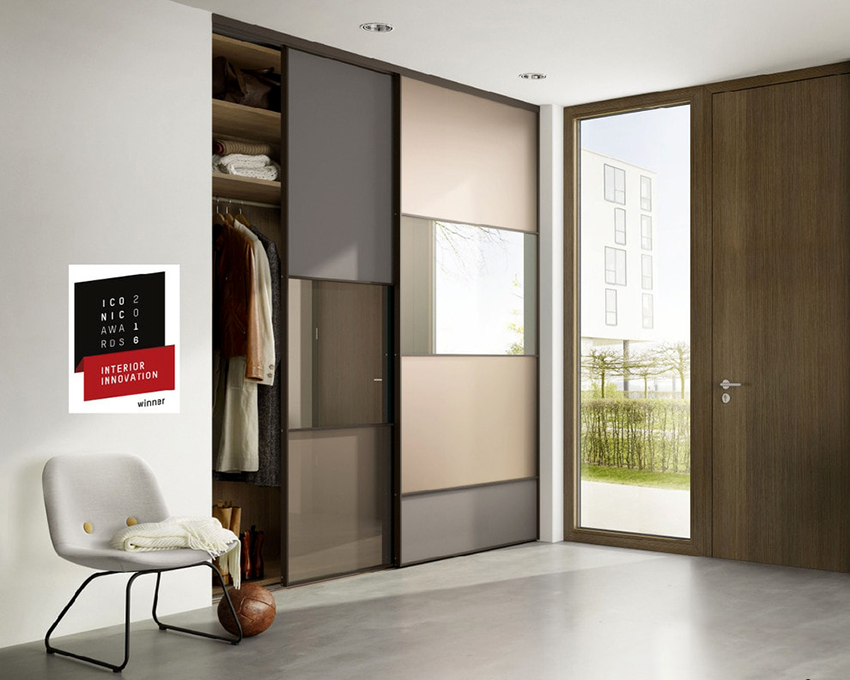 Para diversificar los armarios de puertas correderas, que generalmente consisten en solo unos pocos lienzos de puertas correderas, se utiliza una combinación de esquemas de color para crear fachadas.