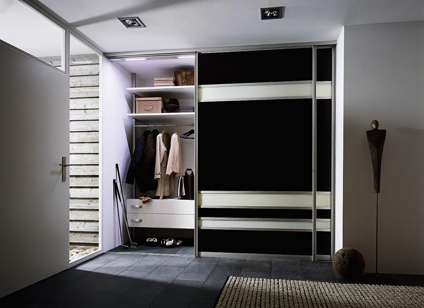La opción para llenar el armario se selecciona de acuerdo con el propósito de la habitación. Para el pasillo, es importante organizar un compartimento con una barra para almacenar artículos largos de temporada. En la parte inferior habrá zapatos de temporada y en la parte superior, sombreros. Es importante proporcionar ganchos para paraguas y un compartimento para bolsas. También es importante organizar un estante o cajón para los productos para el cuidado del calzado, que se muestra claramente en la imagen del gabinete.