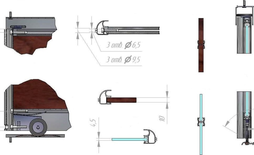 Los rieles no solo se utilizan para soportar los carros de rodillos. La barra superior, que tiene ranuras en forma de U, donde se inserta el borde superior de la hoja, excluye el movimiento de las puertas cuando se mueven. La mayoría de las veces no hay carga en el riel superior. El riel inferior con relieve redondeado, que toma la carga principal de las puertas, está diseñado para mover las hojas.