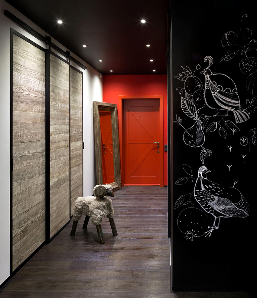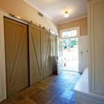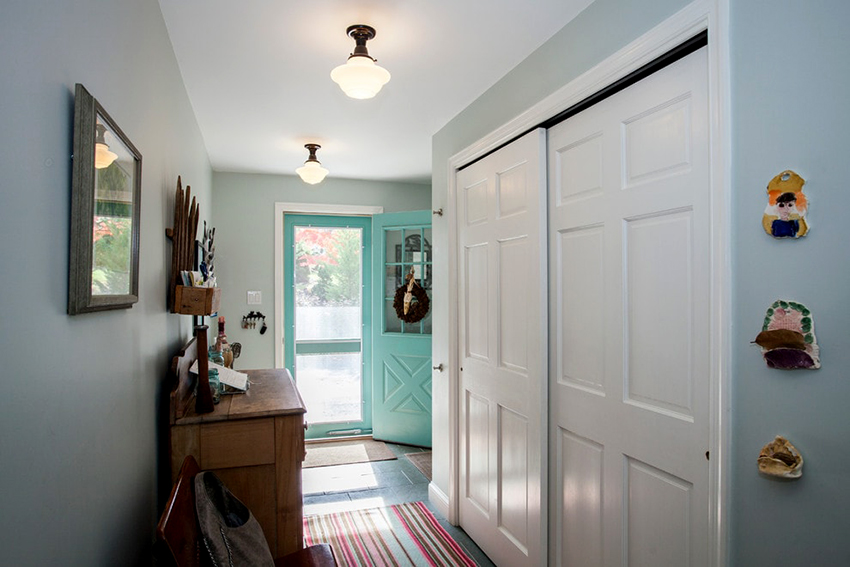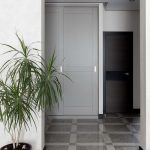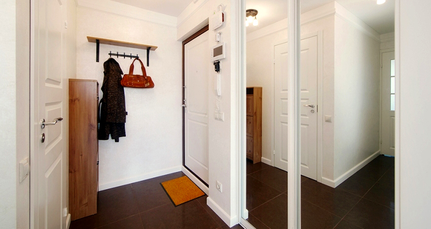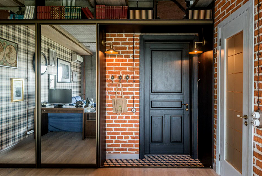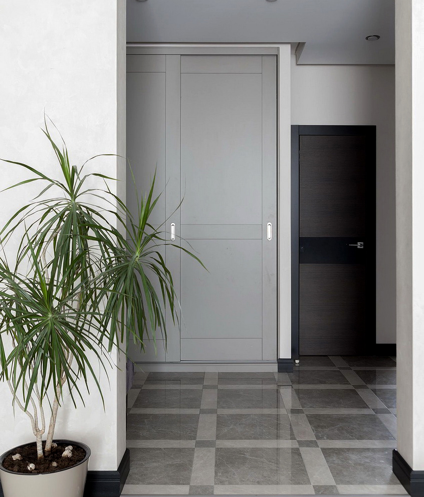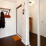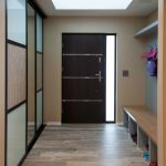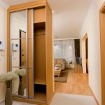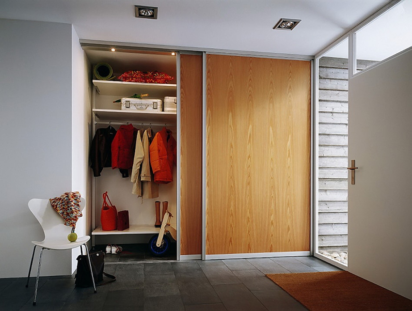 La construcción de panel a panel tiene paredes laterales. Esta es una buena opción para una habitación con dos salidas ubicadas en el mismo plano. Si la puerta de entrada está en el medio de la pared, la opción más adecuada para un uso racional del espacio libre es un modelo con un entrepiso sobre la abertura. El armario enmarca la puerta en todo el perímetro, convirtiéndolo en un punto culminante del interior.