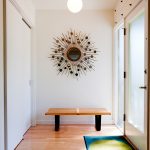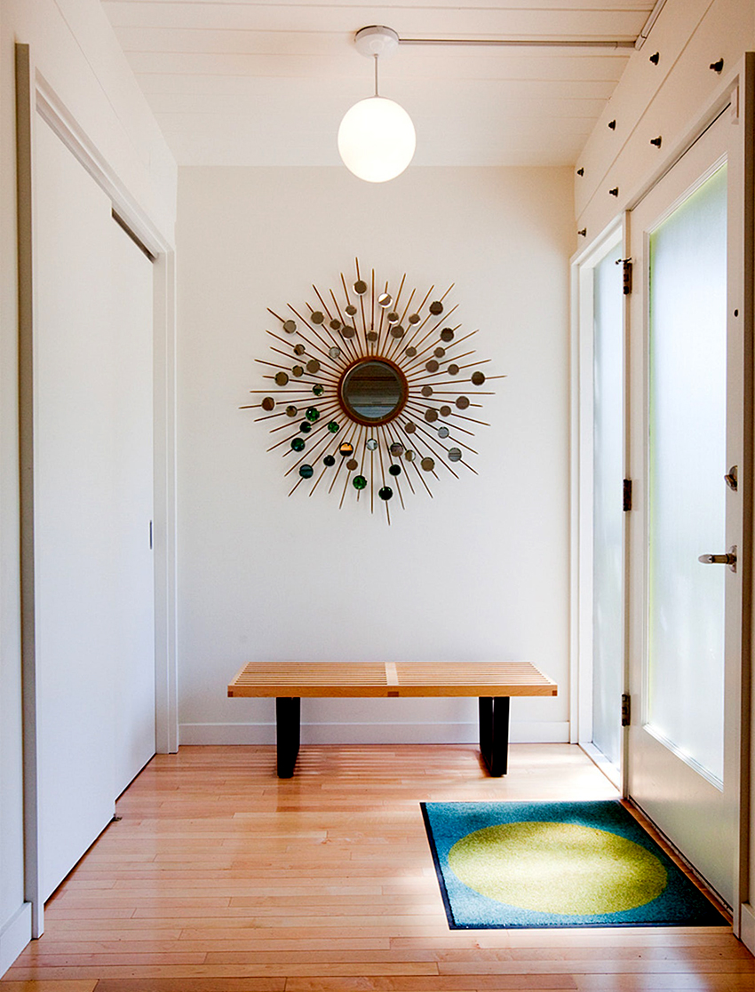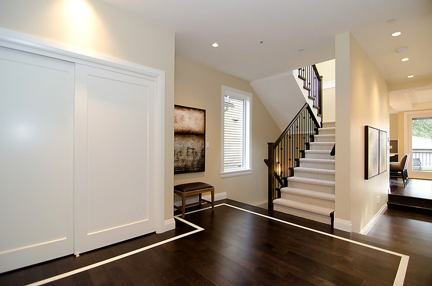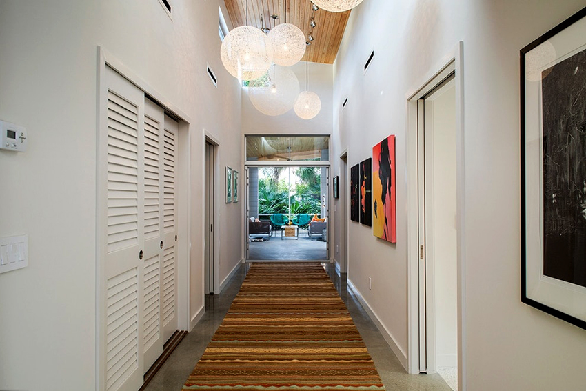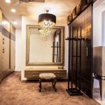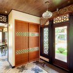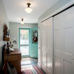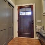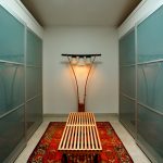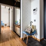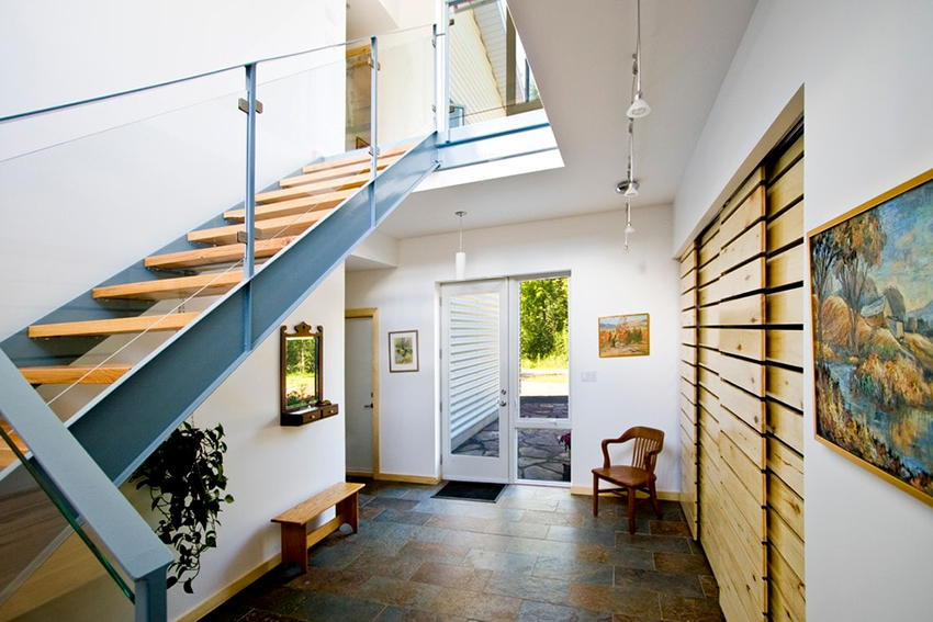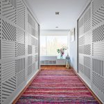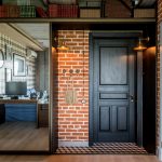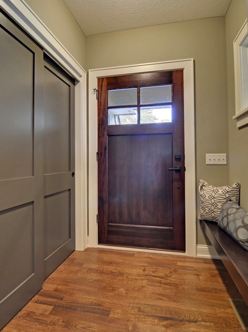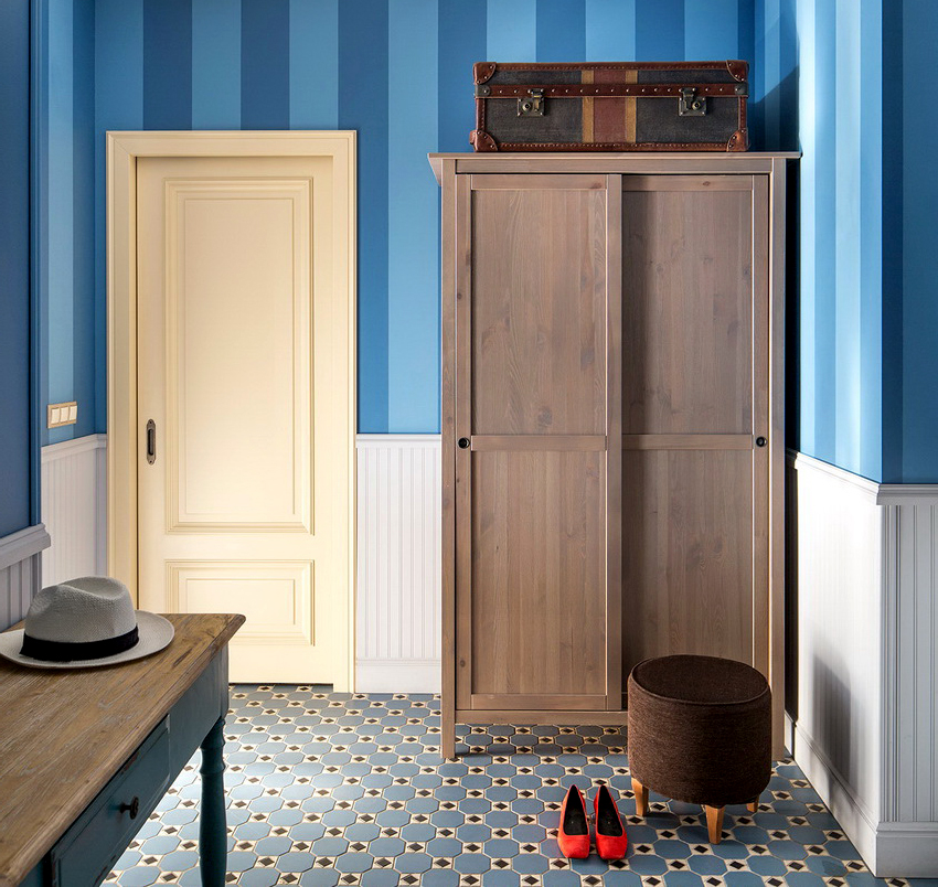 La construcción de panel a panel tiene paredes laterales. Esta es una buena opción para una habitación con dos salidas ubicadas en el mismo plano. Si la puerta de entrada está en el medio de la pared, la opción más adecuada para un uso racional del espacio libre es un modelo con un entrepiso sobre la abertura. El armario enmarca la puerta en todo el perímetro, convirtiéndolo en un punto culminante del interior.