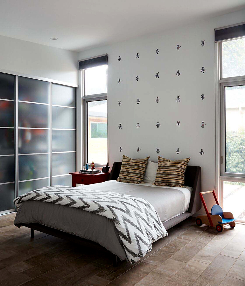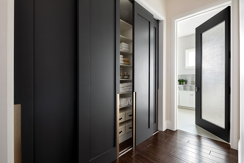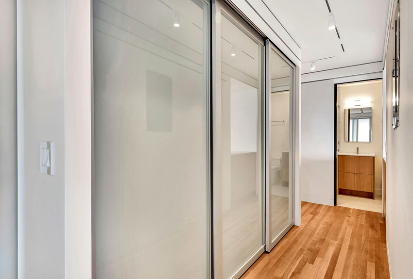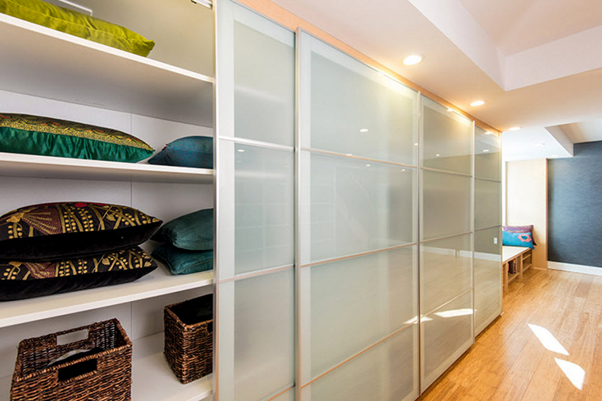 Los frentes de vidrio pulido con chorro de arena de los armarios corredizos no solo se ven geniales, sino que también aportan algo de frescura y ligereza al interior