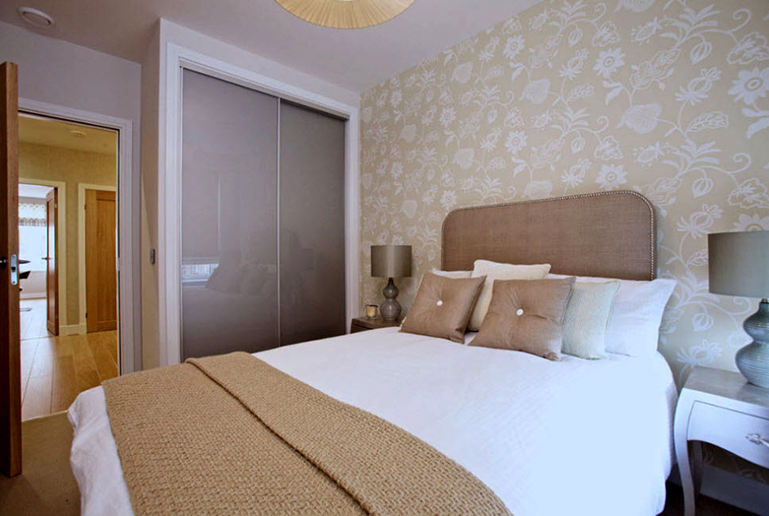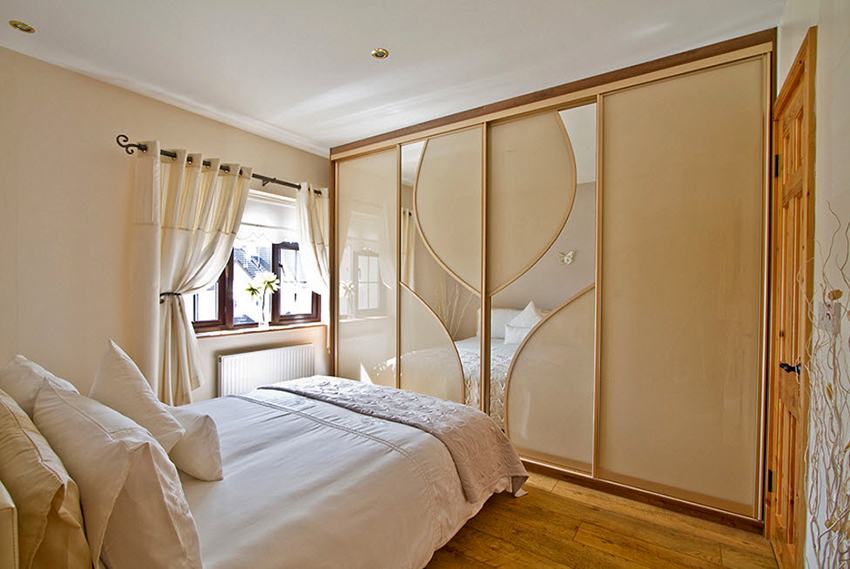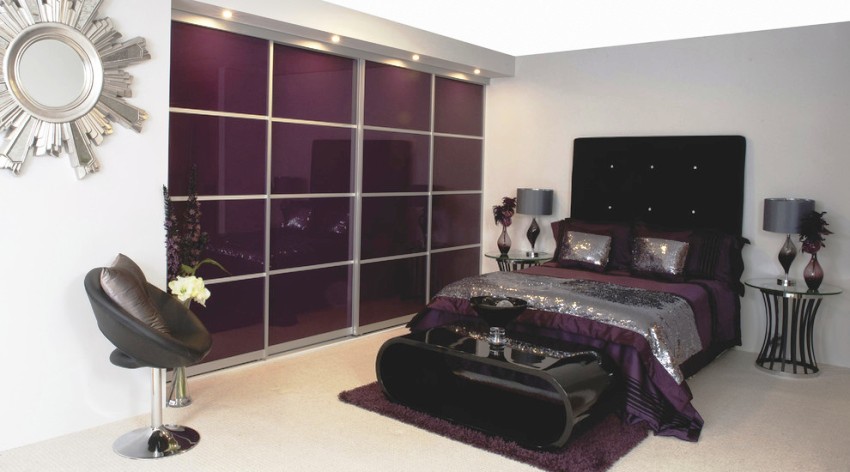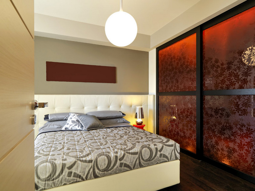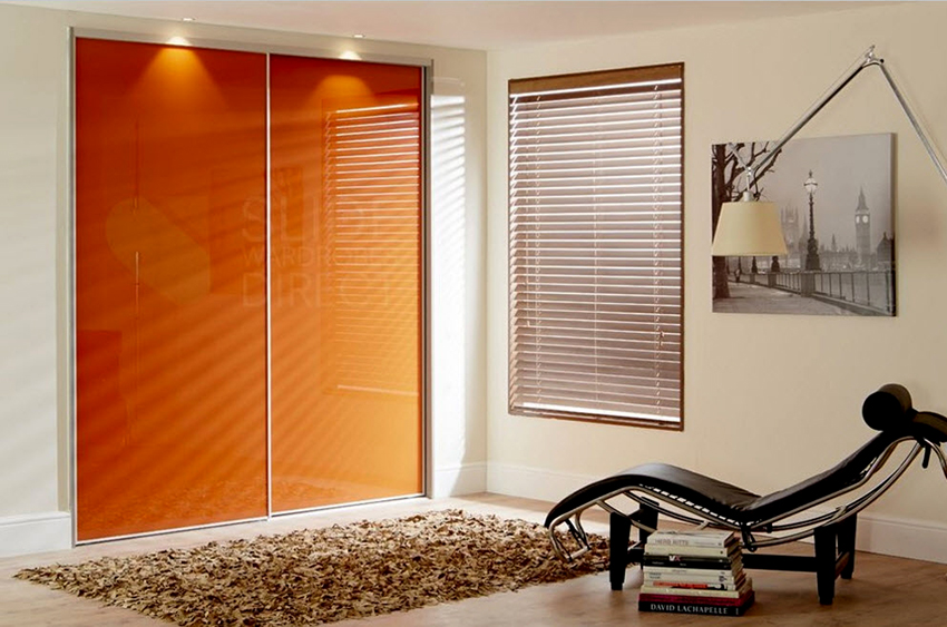 Otro tipo de superficie de vidrio es lacobel. Es un material opaco que está recubierto por una cara con una capa de barniz de color. Puede elegir cualquier tono de la fachada, de modo que el diseño se adapte al interior de un dormitorio y sala de estar modernos. La superficie puede ser no solo monocromática, sino también multicolor.