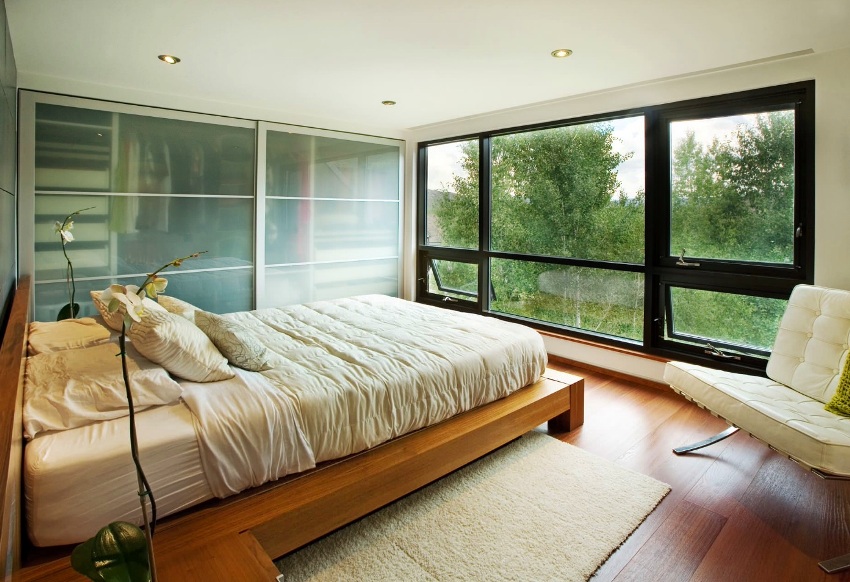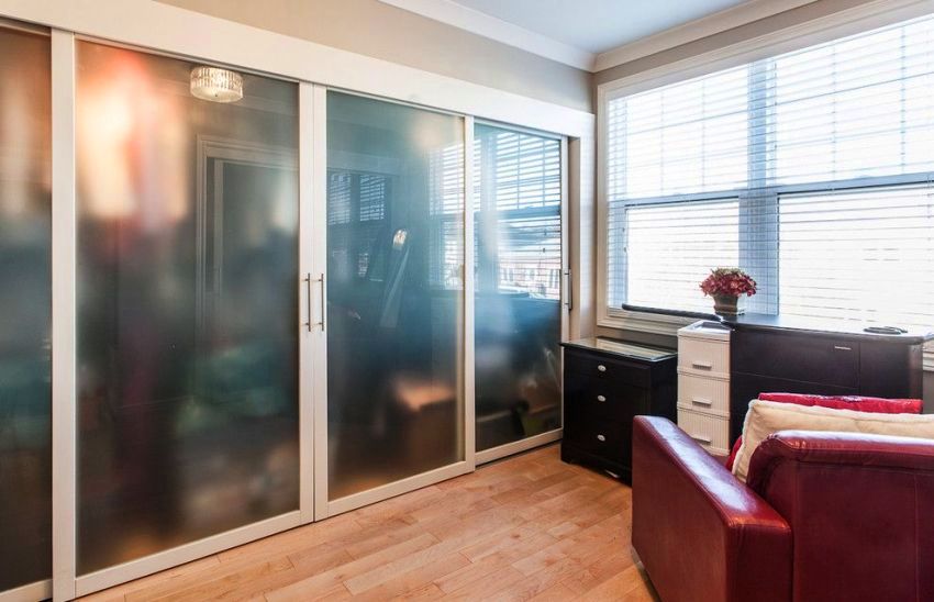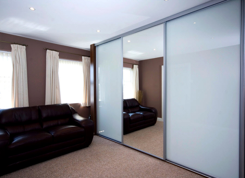Un armario deslizante con un frente de vidrio esmerilado es adecuado para dormitorios y salas de estar, decorado en cualquier dirección estilística. Debido a su apariencia discreta y colores tranquilos, la estructura encajará favorablemente en una habitación pequeña, aumentando visualmente su espacio, que se muestra claramente en la foto del gabinete en la sala de estar.