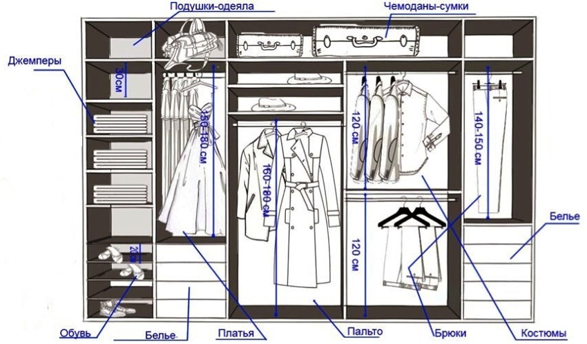 Para el uso más efectivo del armario, es importante utilizar racionalmente cada centímetro del espacio interior, que debe planificarse adecuadamente. El área de la estructura se divide convencionalmente en tres zonas: superior, media e inferior, que se muestra claramente en el diagrama de vestuario.El compartimento superior es conveniente para guardar artículos de temporada y otros artículos de guardarropa de uso poco frecuente.