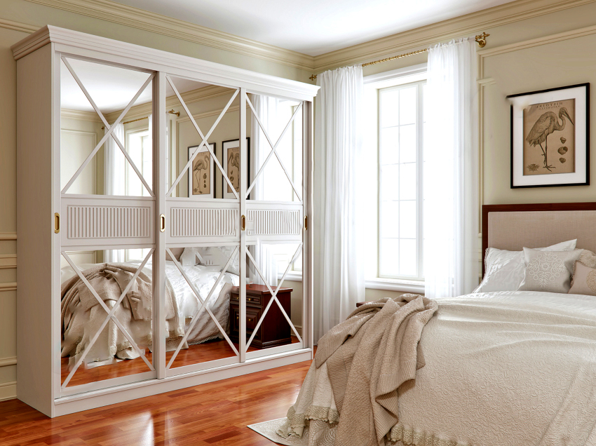 Un armario con una fachada espejada ayudará a enfatizar el estilo de decoración de la habitación y la combinación de colores de la habitación. Está cubierto con una película especial que protege el producto de daños mecánicos. La principal ventaja de un armario deslizante con espejo, las fotos lo demuestran claramente, es el aumento visual del espacio, que es especialmente importante para espacios pequeños y confinados. Dicha fachada se puede combinar con cualquier diseño de interiores sin abarrotarlo, lo que lo hace ligero y elegante. Se puede aplicar un patrón mate a la superficie del espejo, haciendo de la fachada una decoración original de la habitación.