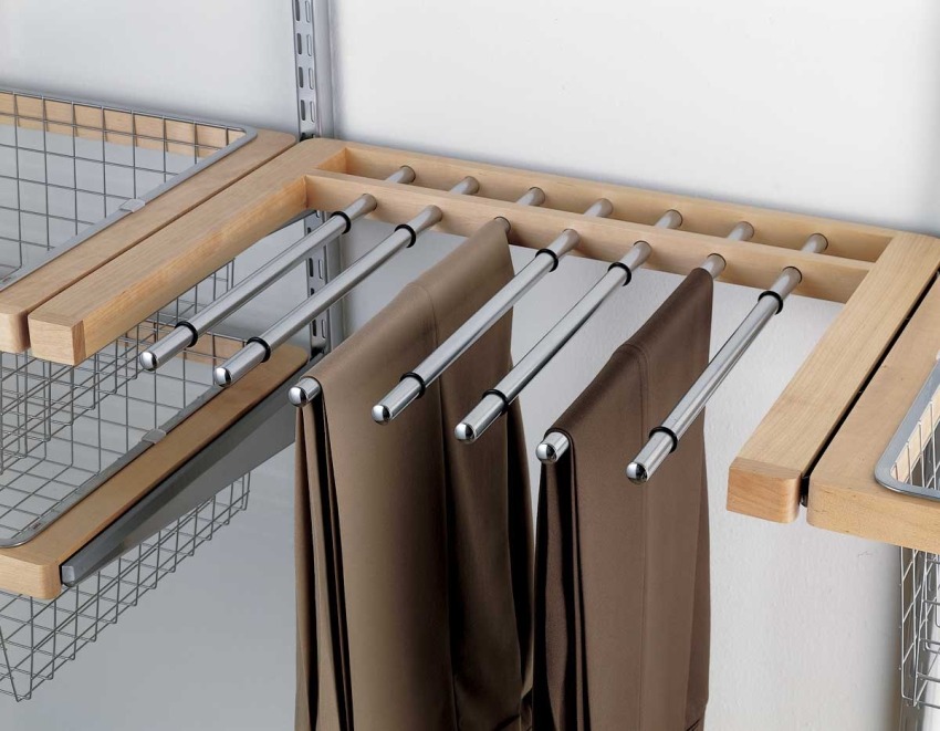 Los estantes pueden ser estacionarios, extraíbles o de malla. La primera opción está representada por componentes fuertes que pueden soportar un peso significativo. Por lo tanto, pueden almacenar no solo prendas, sino también artículos de tecnología. Los estantes extraíbles son convenientes para camisas, camisetas, camisetas, pantalones cortos y jeans. Las estructuras de malla están diseñadas para almacenar corbatas, cinturones, tirantes y otras piezas pequeñas.