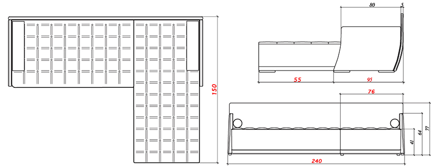 El sistema de transformación "cama plegable francesa" es mucho menos común en los sofás de esquina. Es un mecanismo de despliegue. El lugar para dormir en la estructura se almacena enrollado. Cuando se transforma, esta parte se despliega y avanza. Normalmente, este bloque mide 200 cm de largo.